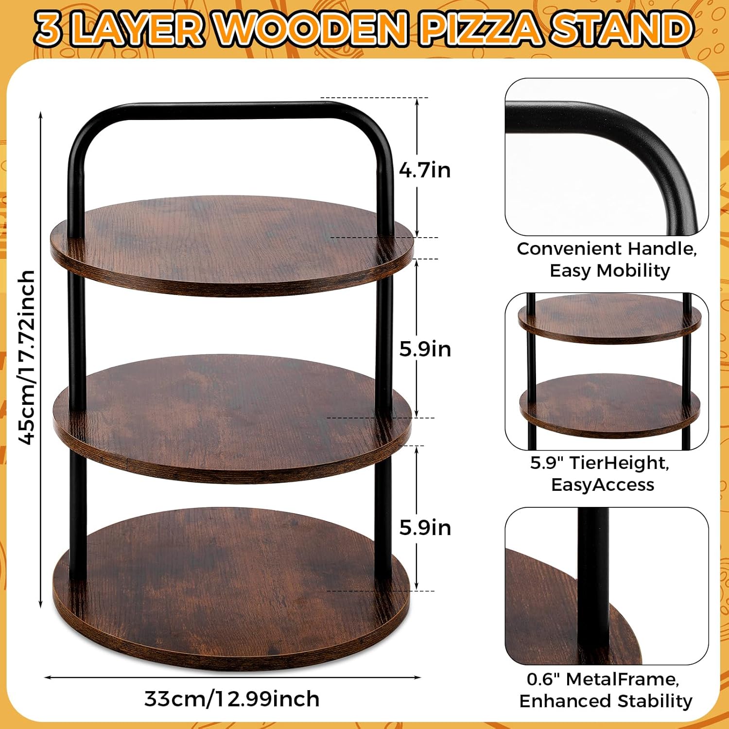 Features: This pizza stand can hold various foods to save space, the non slip base ensures stability to prevent tipping over. The wooden handle pizza cutter is heat resistant to prevent burns. This pizza stand set is multifunctional, helping pizzas cool down quickly, preventing hot pizzas from damaging the tabletop, and making full use of tabletop or countertop space, making it ideal to apply at home and in restaurants. Specifications: Material: wood, iron, stainless steel Color: brown Size: pizza stand: about 12.99 x 17.72 inches/ 33 x 45 cm Pizza servers: about 2.36 x 9.84 inches/ 6 x 25 cm Package includes: 1 x Pizza stand 3 x Pizza servers Notes: Manual measurement, please allow slight errors on size. The color may exist a slight difference due to different screen displays