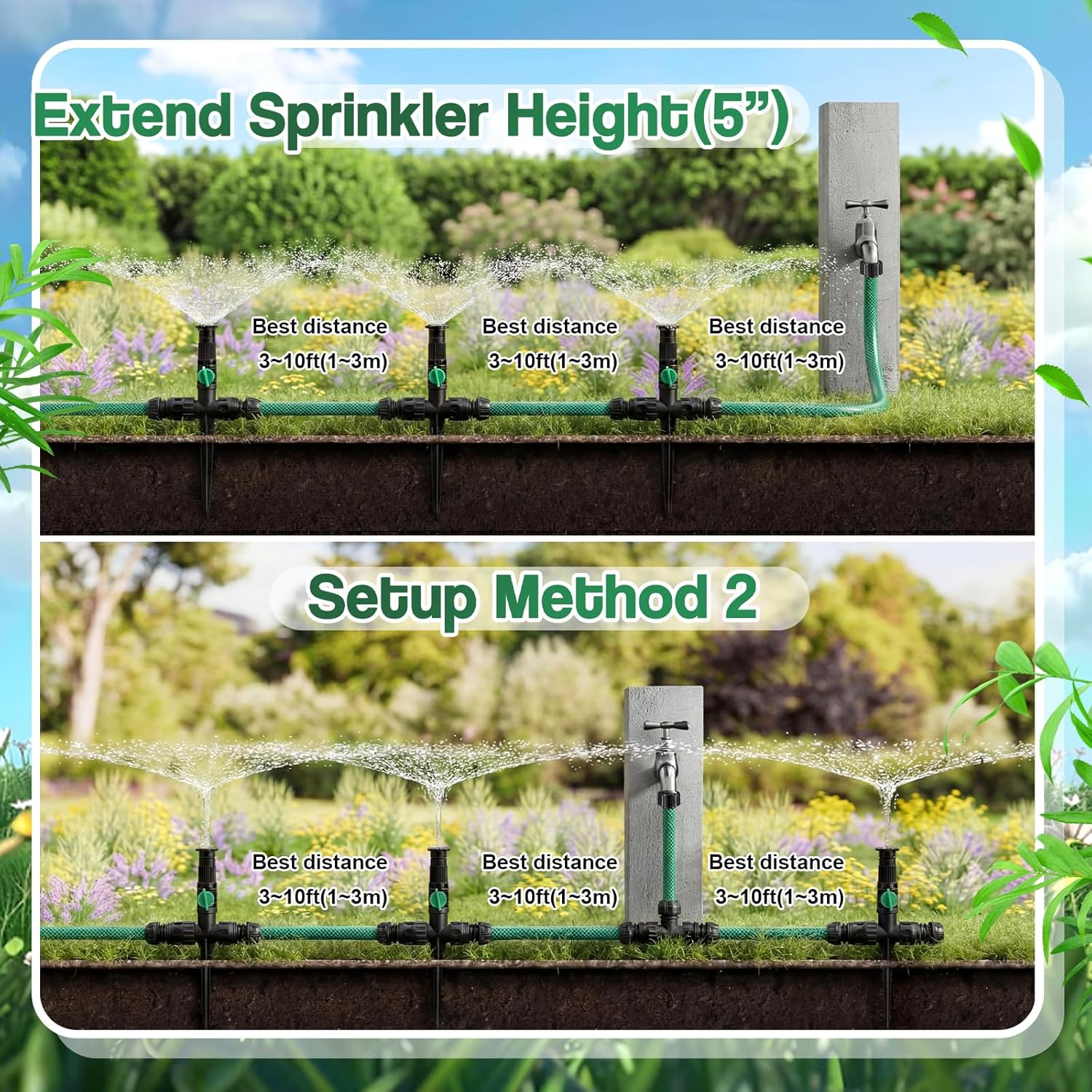 Features: Multi adjustable sprinkler heads for spray angle and water flow Tool free installation and flexible layout for various garden shapes Ideal for watering flower beds vegetable gardens lawns and patios Specifications: Material: metal (connectors), plastic (sprinkler body), PVC (hose) Color: green, black Size: system hose: about 14.7ft/4.5m Package includes: 4 x Above Ground Sprinkler Kits Each Kit Includes: 1x 14.7ft Hose, 2x Stakes, 4x Connectors, 2x Extension Tubes, 1x Faucet Connector, 1x T-Connector, 1x Hose Joiner Notes: Manual measurement, please allow slight errors on size. The color may exist a slight difference due to different screen displays