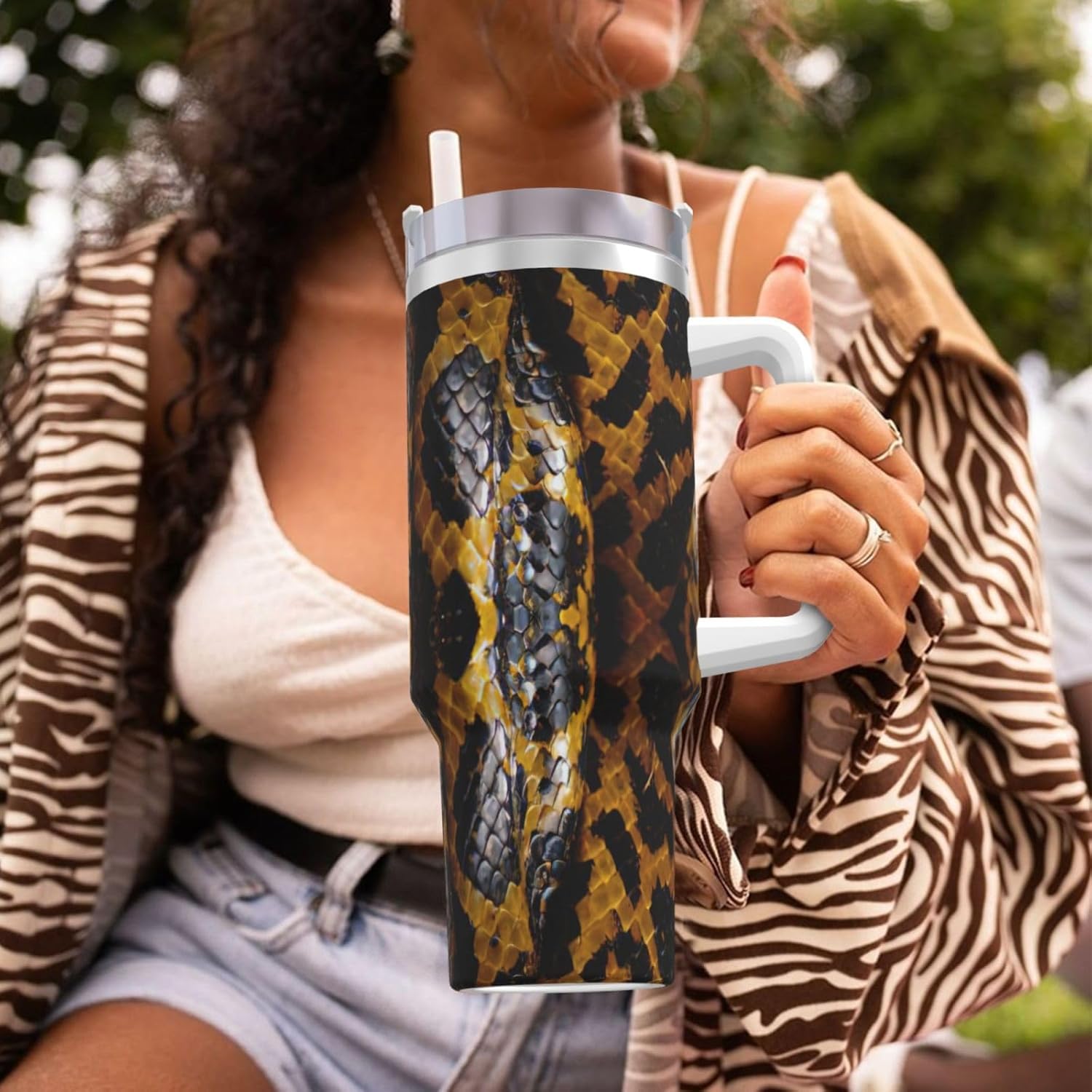 This Yellow Snake Print Ice Bully Cup features a double layer stainless steel design that can be used for a long time without rusting. The lid has good sealing to prevent water from overflowing, and it is easy to unscrew for filling and cleaning. It can keep water, coffee, or drinks warm or cool for hours and is suitable for travel, camping, and driving.