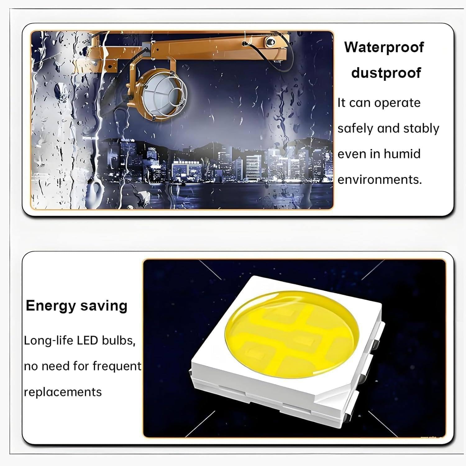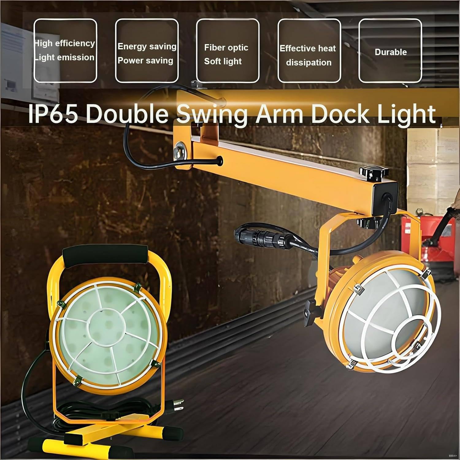 Introducing our high-efficiency LED Loading/Unloading Platform Light, designed to enhance your workspace with powerful, energy-saving illumination. With 360° precise lighting, this fixture eliminates blind spots, making it ideal for cold storage areas, logistics warehouses, docks, trailers, containers, and other similar environments. **Specifications:** - **Product Name:** LED Loading/Unloading Platform Light - **Color:** Yellow - **Body Material:** Die-cast Aluminum - **Voltage:** 110V, 220V-240V - **Power:** 50W - **Luminous Flux:** 6000 ±10% - **Color Rendering Index:** >80Ra - **Power Factor:** >0.9 - **Waterproof Rating:** IP65 - **Illumination Range:** 6 meters (19.68 feet) - **Installation Height:** Diameter 1197.99 cm (471.64 inches), Average Illuminance 28.54 lux - **Lamp Head Size:** 20x24.35 cm (7.87x9.59 in) - **Package Size:** 68x35x29 cm (26.77x13.78x11.41 in) - **Gross Weight:** 11 kg (24.25 lbs) **Key Features:** - **Convenient Dual Switch Control:** Easily operate your lighting setup to cater to your needs. - **360° Rotatable Lamp Head:** Achieve targeted lighting wherever necessary, ensuring maximum visibility. - **Double Strut Design:** Offers both vertical and horizontal adjustments for customized placement. - **Energy Efficient:** Utilizes high-brightness LEDs with a lifespan that saves up to 70% energy compared to traditional bulbs. - **Concealed Wiring:** The folding arm design hides wires for a clean look while enhancing safety. **Package Includes:** 1 x Lamp holder 1 x Folding arm Transform your loading and unloading experience with our LED light, providing the perfect balance of durability, efficiency, and versatility. Illuminate your workspace and ensure safety and productivity with our innovative lighting solution.