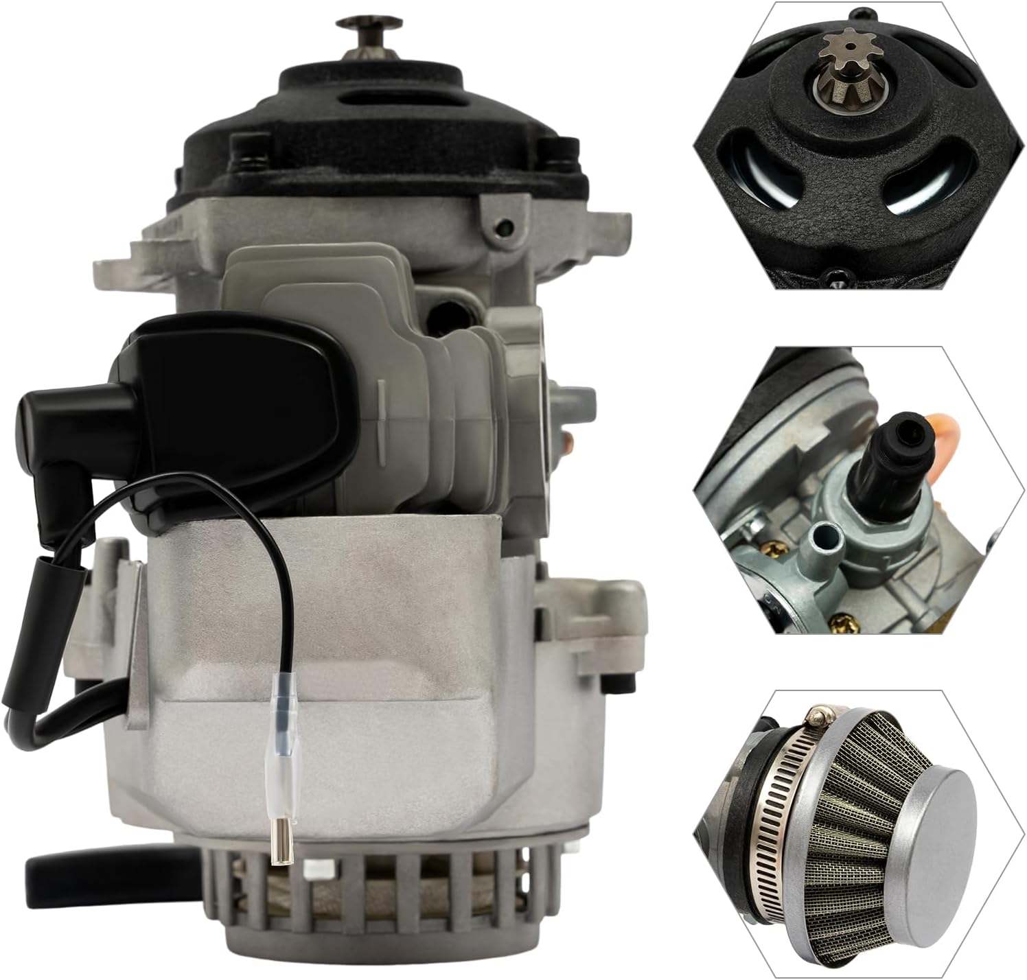 Specifications⚙️Applicable Models: For 49CC Two-stroke MotorcyclesCondition: NewMaterial: Aluminum, IronColor: Black, SilverStyle: ModernIgnition System: Electronic IgnitionStart Mode: Hand-pulled Self-Returning Rope StarterEngine Type: 2-Stroke Single Cylinder Engine, Air Cooling Displacement: 49ccMaximum Power (5~15min): 1.9kw/7000rpmRated Power (12h Power): 1.7kw/6000rpmContinuous Power (300h or More Power): 1.6kw/5500rpmOverload Power (1h Power): 1.83kw/6500rpmMaximum Torque: 2.7N.M/6500rpmMaximum Horsepower: 3PSCylinder Diameter: 44mm/1.73inStroke: 32.8mm/1.29inMinimum Fuel Consumption Rate: <610g/1.34lbs/KW.hFuel: 90 Unleaded Gasoline(Not Included)Lubrication Oil: FC Grade 2-stroke Gasoline Engine Oil(Not Included)Gasoline to Oil Volume Mixing Ratio: 25:1(Break-in Period), 30:1(Late Break-in Period)Spark Plug Clearance: 0.5mm/0.02inFuel Tank Capacity: 1.2L/0.32galDeceleration Ratio: 1:1No-load Speed: 12500rpmNoise: 100.7dB(A)(Sound Pressure Level); 116.9dB(A)(Sound Power Level)Gross Weight: 3.7kg/8.16lbsNet Weight: 3.4kg/7.5lbsPackage Size: 34*14*25cm/13.39*5.51*9.84inPackage Included📦1* 49CC Mini Motorcycle EngineNotes🔍1.Please check whether this item can fit in your car before purchasing. 2.We strongly recommend professional installation. 3.Please allow for slight color differences caused by shooting light and errors caused by manual measurement, and make sure you don't mind before ordering. If you have any questions, please contact us, and we will reply and solve your problem as soon as possible