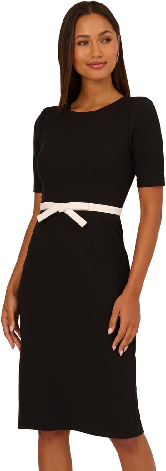 Cut in a classic sheath silhouette, this dress delivers timeless polish with a touch of charm. Its tailored from crisp knit crepe and sculpted with princess seams through the bodice and the knee length skirt. A crew neckline and short elbow sleeves offer clean lines, while a thin contrast waistband with a front bow adds a sweet, retro chic finish. This dress is an easy yet elegant choice for office meetings, business dinners, and daytime celebrations.