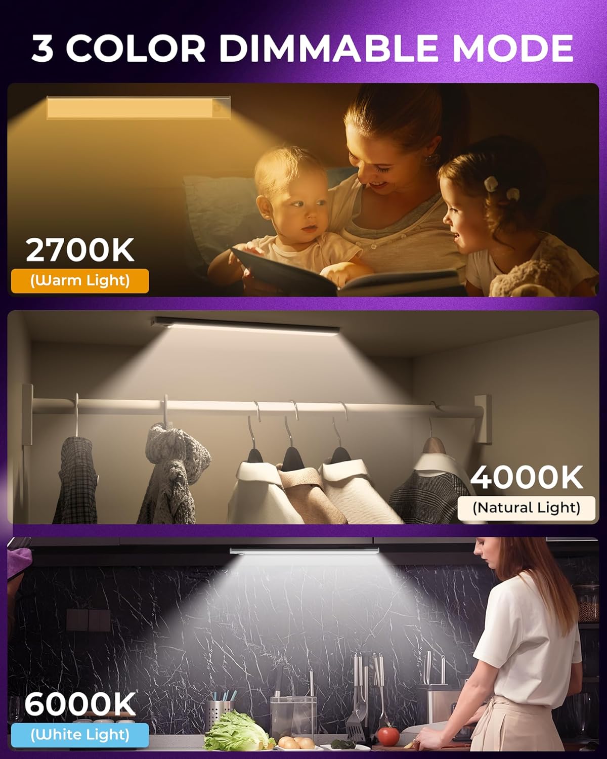 | Light Color | 6000K Cool White, 4500K Daylight White, 3000K Warm White |