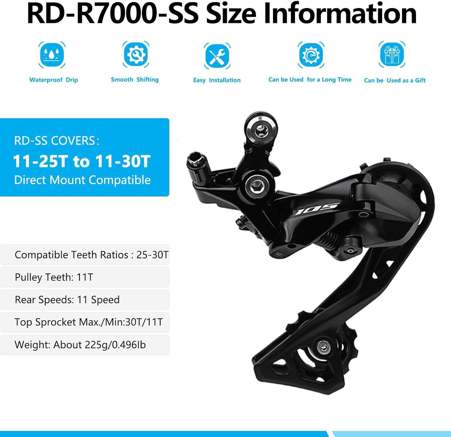 Bike Rear Derailleur RD-R7000-SS 11 Speed Derailleur Direct-Mount for Road Bike The Rd-R7000 11 Speed rear derailleur compatible with 11-speed systems, ensures accurate gear changes for a seamless ride 11speed derailleur is suitable for low-speed 25-30t setups with a maximum 30t chainring, catering to various riding scenarios and providing riders with flexible options Featuring a slender profile and lightweight construction, enhancing the overall aesthetic appeal of the bike while maintaining optimal performance Directly mounts to the rear of the bike, simplifying the installation process and eliminating the need for additional mounting hardware. Ensure the correct installation method is chosen before purchase