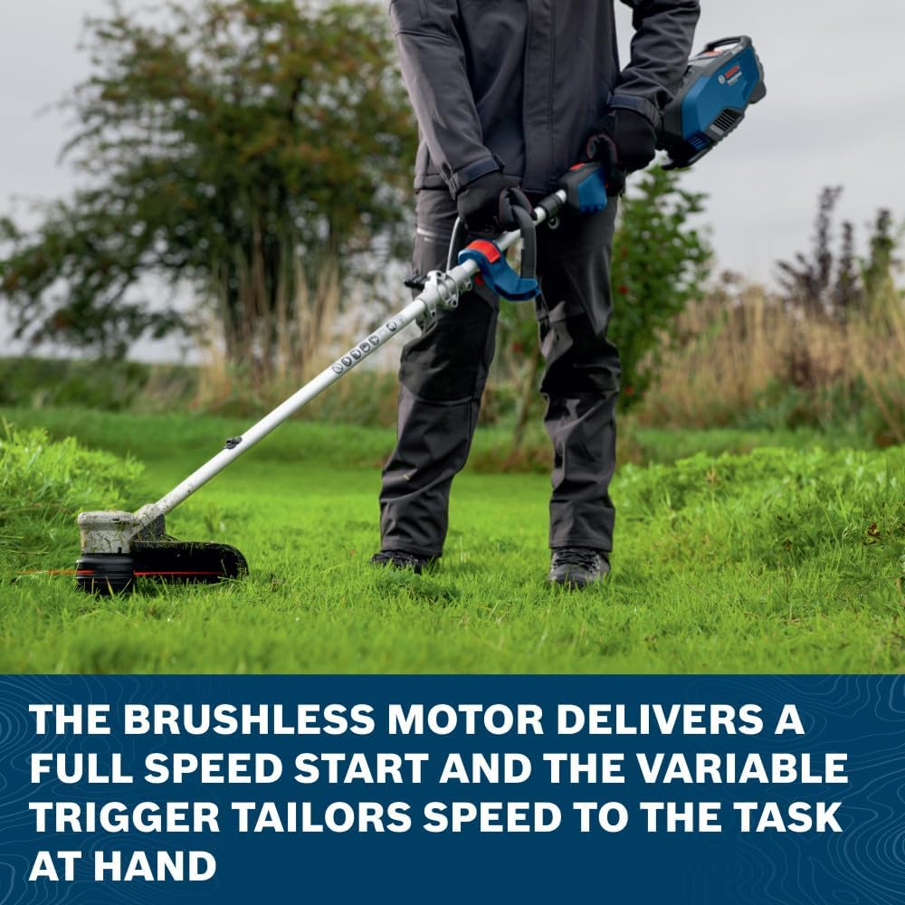 The Bosch GRT18V-40 String Trimmer is the ideal cordless solution for tackling tough weeds and precise edging applications. The featured Bosch-Exclusive Anti-Tangle System helps prevent the trimmer from being entangled with grass and weeds, delivering continuous cutting for increased productivity. The trimmer features a dual line cutting spool with a 16 In . cutting swath and a Pro-Tap spool that automatically adjusts the line length and reloads without opening the spool for fast, hassle-free start-up. Equipped with a powerful, efficient brushless motor, the string trimmer reaches a max speed of 5,300 RPM s, while constant electronics allow for continuous trimming even under heavy load. The variable-speed trigger helps to match the speed of the trimmer to the job at hand. A dual-function hand grip and toolless adjustable D-handle let workers switch effortlessly between trimming and edging. Lightweight and well-balanced, the trimmer reduces operator fatigue, and its protective guard helps contain debris for more controlled, clean work. Durable aluminum motor housing and a robust spool with aluminum eyelet deliver lasting performance. The string trimmer is compatible with both 0.080 In. and 0.095 In. trimmer lines and features three different hanging options for easy storage.