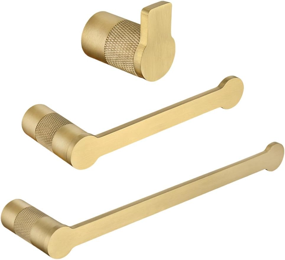 Bath Hardware Set Finishing:BrushedSurface Finishing:BrushedMain Material:MetalMaterial:CopperType:Bath Hardware SetsType:Bathroom AccessoriesMaterial:SUS304 Stainless Steel BrassInstallation:Screw Wall MountedColor:Brushed GoldGREAT PERFORMANCE TO ANTI RUST:Our bathroom hardware set is made of metal premium SUS304 type stainless steel, corrosion-resistant, heavy-duty, and never rust. 4 protective layers are added to SUS304 stainless steel to make it more durable, firmer, more rust-proof and smooth.FINISHING PROCESS:The towel bar set brings unsurpassed beauty to your kitchen or bathroom and resists spots and scratches to ensure flawless appearance for years. This feature means that you will spend less time and money on maintenance through everyday use.SAFE DESIGN:the bathroom hardware accessory sets are designed with clean lines and sturdy construction. Unique shape and concealed mounting hole add a touch of modern design to your bathroom, chamfering edges protect your body from scratching.CLEAN & TIDY:The bathroom hardware kit provides easy access and display of towels, robe and toilet paper for your bathroom.and it can match your black shower faucet and bathroom faucet perfectlyEASY TO INSTALL:You need to use allen wrench release the screws on base plates, mark and drill holes on the wall, insert expansion archors, put the base plate over the archors and insert screws, attach the post onto the base plate, and use a Allen wrench to tighten the screws.