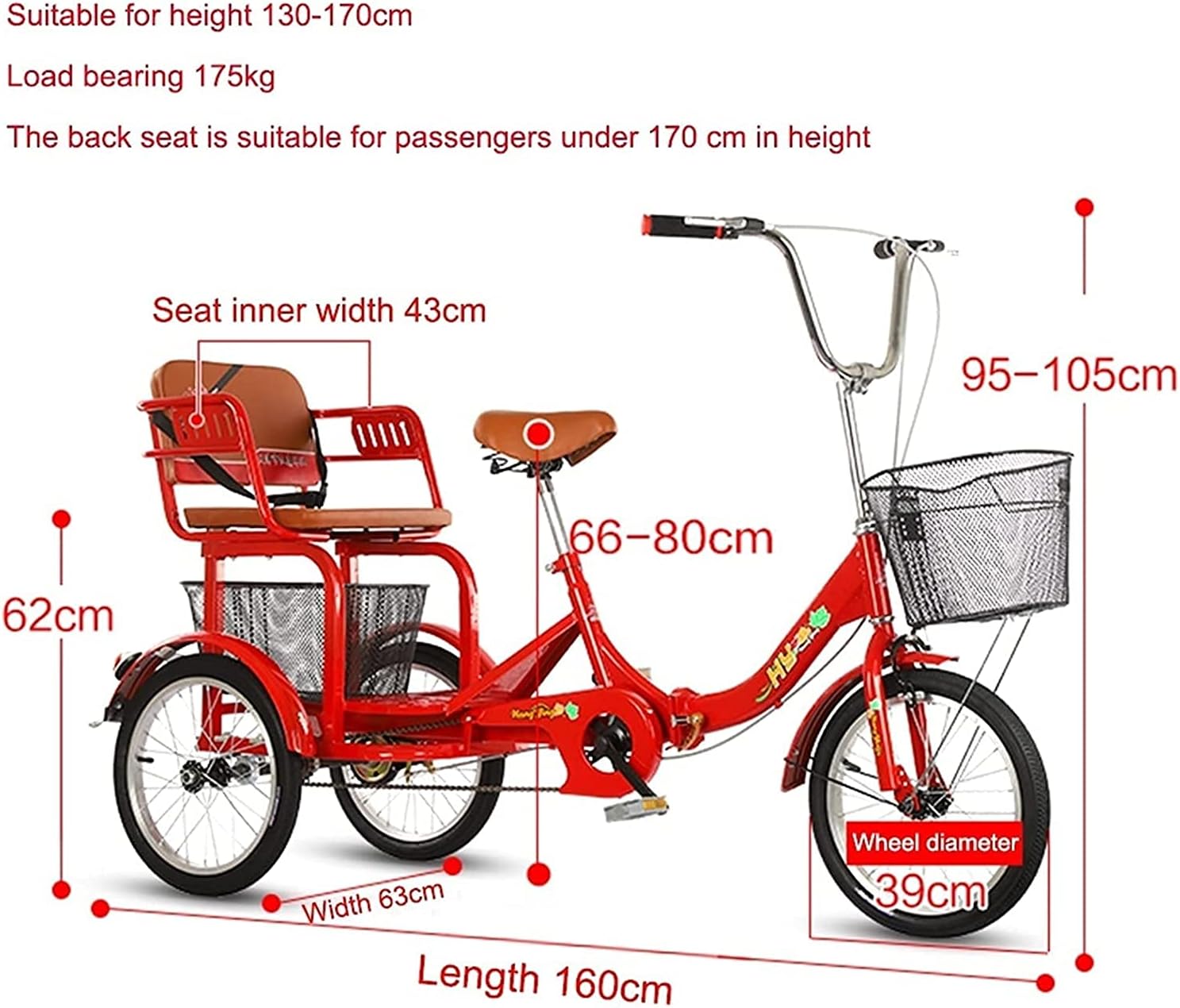 ※(. ? ? ?)※ Bicycle is the best gift for parents and family. Your wife can use it to pick up and drop off children. ※(. ? ? ?)※ Please note: You need to install it yourself, the installation is relatively simple, you can contact us if you have any questions. Since the tricycle is a large product, the product may be slightly scratched during transportation. If you mind, please don't buy. Advantage: Comfortable saddle, ergonomic structure, comfortable, soft, leather Fully closed chain cover, safe and beautiful The exquisite car basket increases the capacity to hold more items, and there is a storage e design under the seat High carbon steel e/double chain drive, sturdy and Two-wheel drive and three flywheels make it easier for the elderly to ride Safe and sensitive braking, sealed bottom bracket to ensure safety Specifications: Product name: adult tricycle Material: high-strength manganese steel e color type: red Applicable object: adults/elderly Product size: 160x63x105CM Tire size: 16 inches Product load: 175kg Rim: Aluminum alloy rim Product advantages: convenient/travel/anti-rollover/loading Note: You need to install it yourself, but don't worry, it's very easy Package includes: 1×Adult tricycle ※(. ? ? ?)※ You can contact us at any time if you have any questions in the process of buying products, we will ask you to answer your questions, and hope that you have a happy shopping and bring you a happy shopping experience!