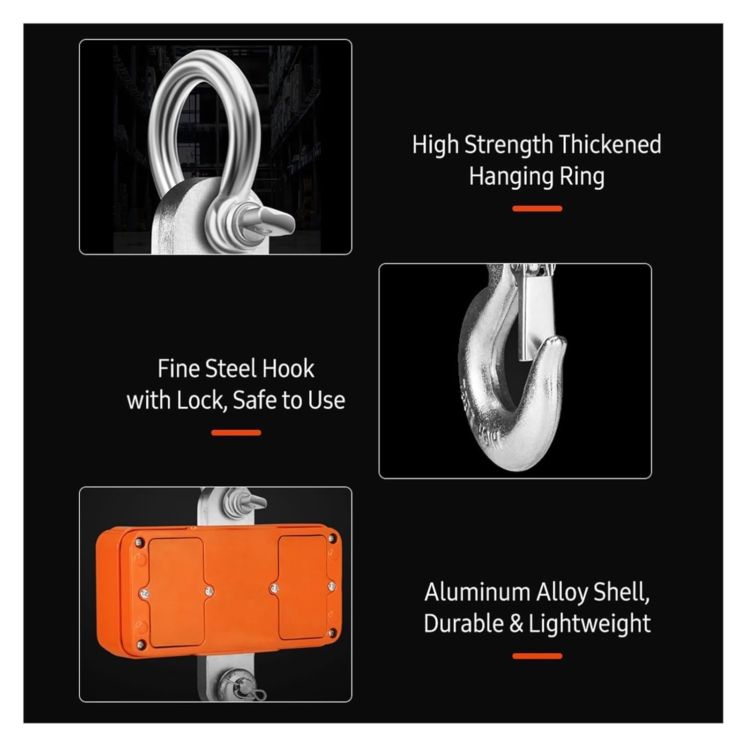 Ease of Operation - 3 buttons on the control panel allow you to operate the crane scale easily. Data hold/tare/zero function, more convenient to use.Work safety—one-piece load structure, precision molded aluminum alloy shell. The high-strength stainless steel hook with lock can effectively prevent objects from falling, making it safer to use.Wide range of use - strong carrying capacity, easily meet the needs of various scenarios such as travel, business trips, express delivery, shopping, fishing, outdoor activities, etc.Note: Due to manual measurement and different light conditions, the size and color may be slightly different, please refer to the actual product. Thanks.Specification:Capacity: 500kg/1000kg/1500kg (optional)color is orangeMaterial: aluminum alloy + steelmaximum. Capacity: 500 kg/1102 lbs; 1000 kg/2204 lbs; 1500 kg/3306 lbsAccuracy: 200g (500kg); 500g (1000kg, 1500kg)Unit switching: N/ lb/ kgRemote control distance: 20m/65ftCrane scale batteries: 4 AA batteriesRemote control battery: 2 AAA batteriesItem size: 28.5 * 14.5 * 4 cm/11.22 * 5.71 * 1.57 inchesItem weight (without batteries): 1300g / 2.87lbspacking list:1 * digital crane scale1 * remote control4 AA batteries2 x AAA batteries1 * User Manual (English)
