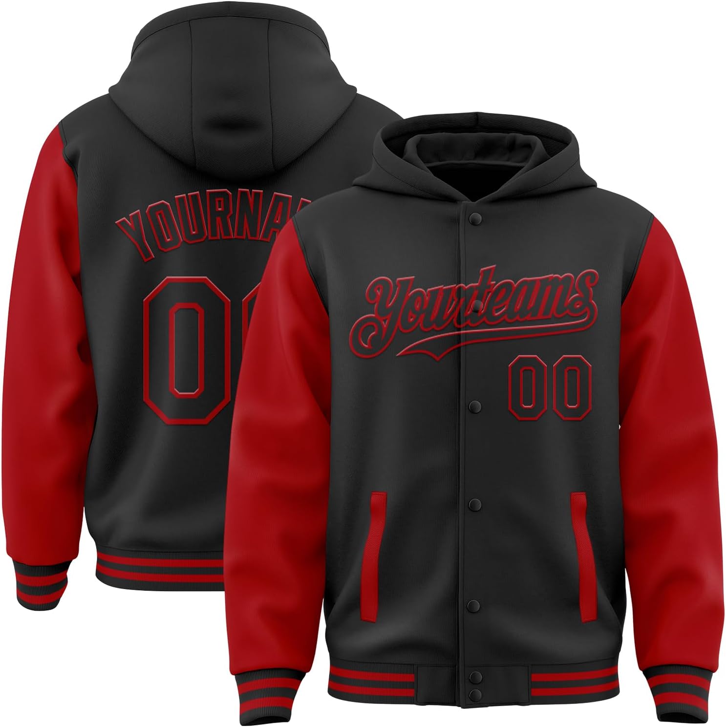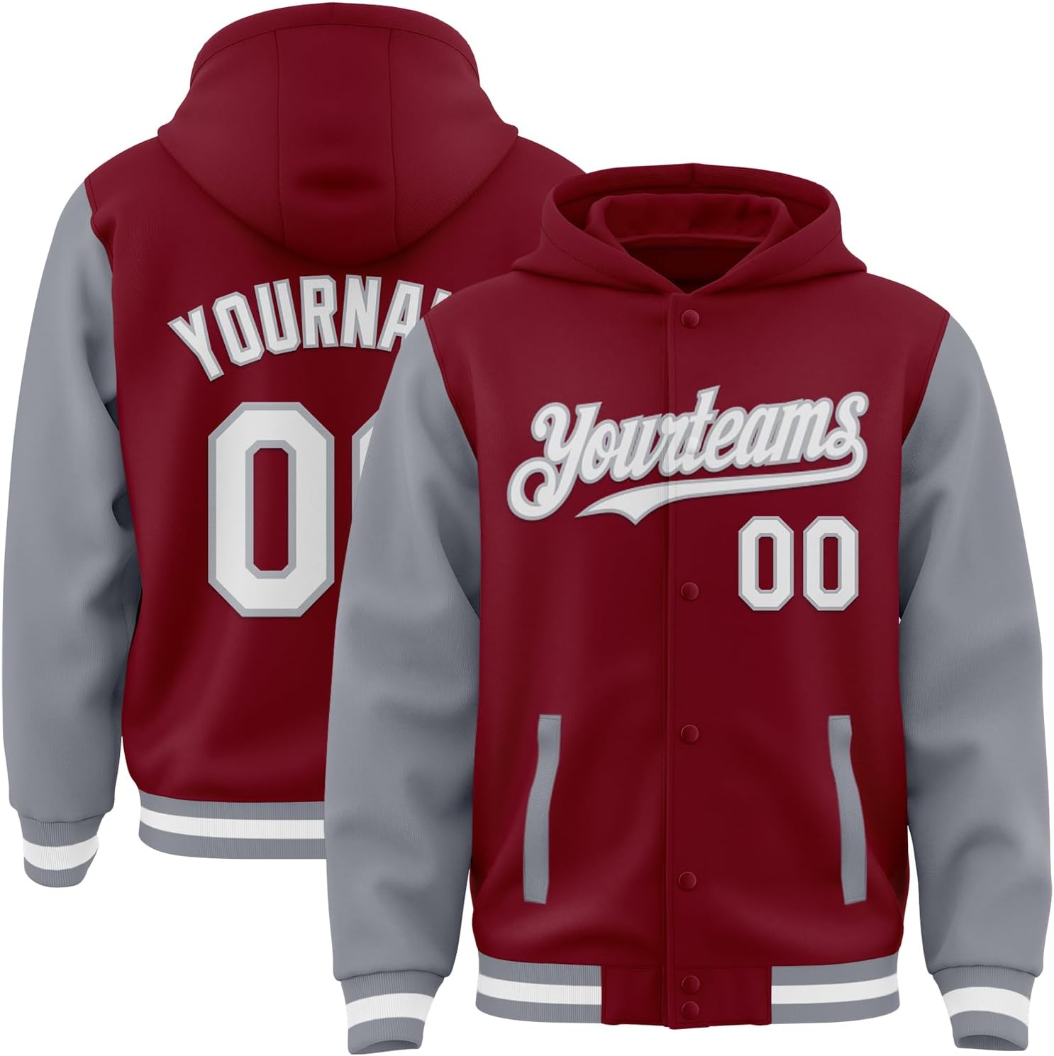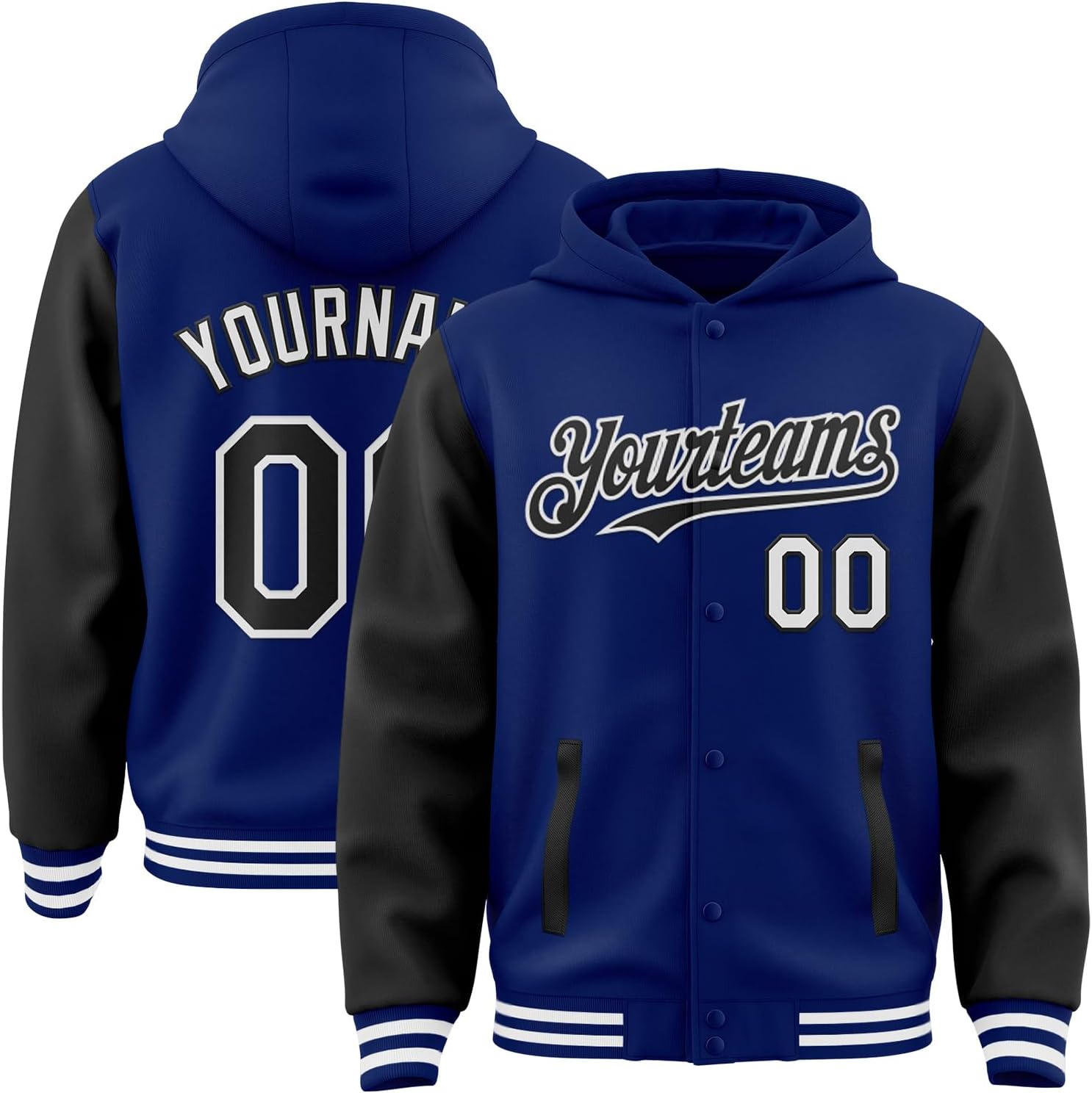 Custom Bomber Full-Snap Varsity Letterman Hoodie Jackets for Men Women Youth Personalized Embroidered Letterman Bomber Hooded Baseball Jackets with Polyester & Leather Sleeve, Design Your Own Name Number Logo Full-Snap Blend Cotton Winter Lightweight Warm Windbreaker Sports Casual Sweatshirts Coats for Baseball Football Hockey Basketball Warm-Up How to customized your personalized hooded varsity letterman jacket? Step 1: Choose the color that you want, click The "Customize Now "button; Step 2: Please choose your the size, sleeve and inside lining types of you want; Step 3: Enter your name or player name, number and the Logo that you wanna design; Step 4: An unique customized bomber baseball hoodie jacket you want finished. Specifications: ✔*Material: 100% Poly Wool ✔*Embroidered Craft: Stitched Team Player Names, Numbers, and Logo ✔*Two Types of Inside Lining Material: Lightweight & Quilted Warm Fabric Lining ✔*Two Types of Sleeve Material: Poly Wool & Leather ✔*Full Snap Front ✔*Baseball Jacket with Hood Design ✔*Two Front Pockets & Two Interior Slip Pocket ✔*Rib-knit Elastic Cuffs & Waistband: Soft And Comfortable ✔*Exquisite Stitching, Fresh and Washable ✔* Machine Washable & Hand Washable, Please Don't Bleach, Tumble Dry Low(Natural Air Drying Recommended) Whether you're a student athlete, a sports enthusiast, or simply looking to add a touch of nostalgia to your wardrobe, our built varsity letterman jacket is the perfect choice. Quality Assurance & Customer Service: All sizes are US sizes, please check carefully before placing an order. The colors may exist slight difference due to different screens. We strictly control the quality of each varsity letterman baseball jacket and provide worry-free after-sales service. If you receive a product with quality issues, please contact us promptly, we will reply within 24 hours.