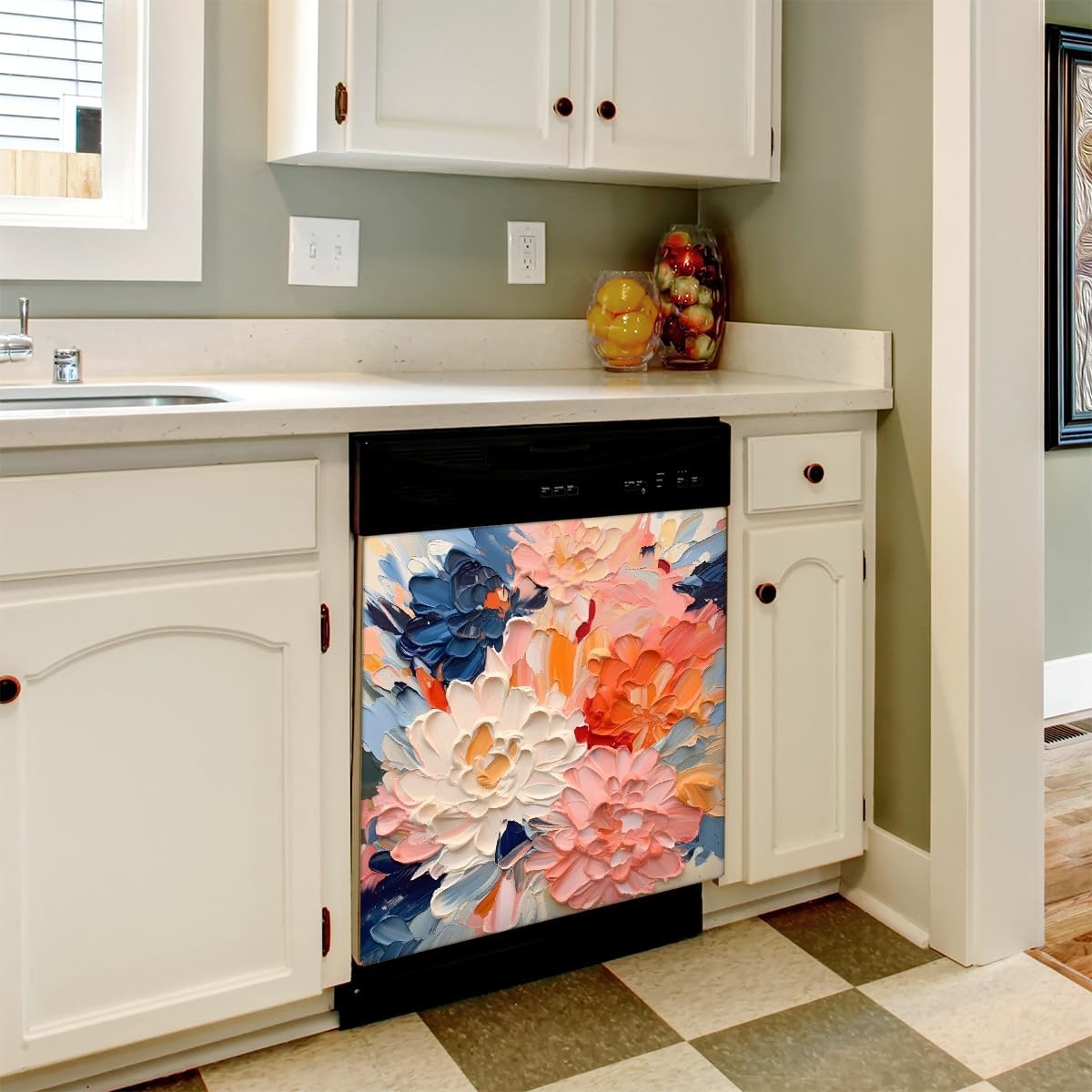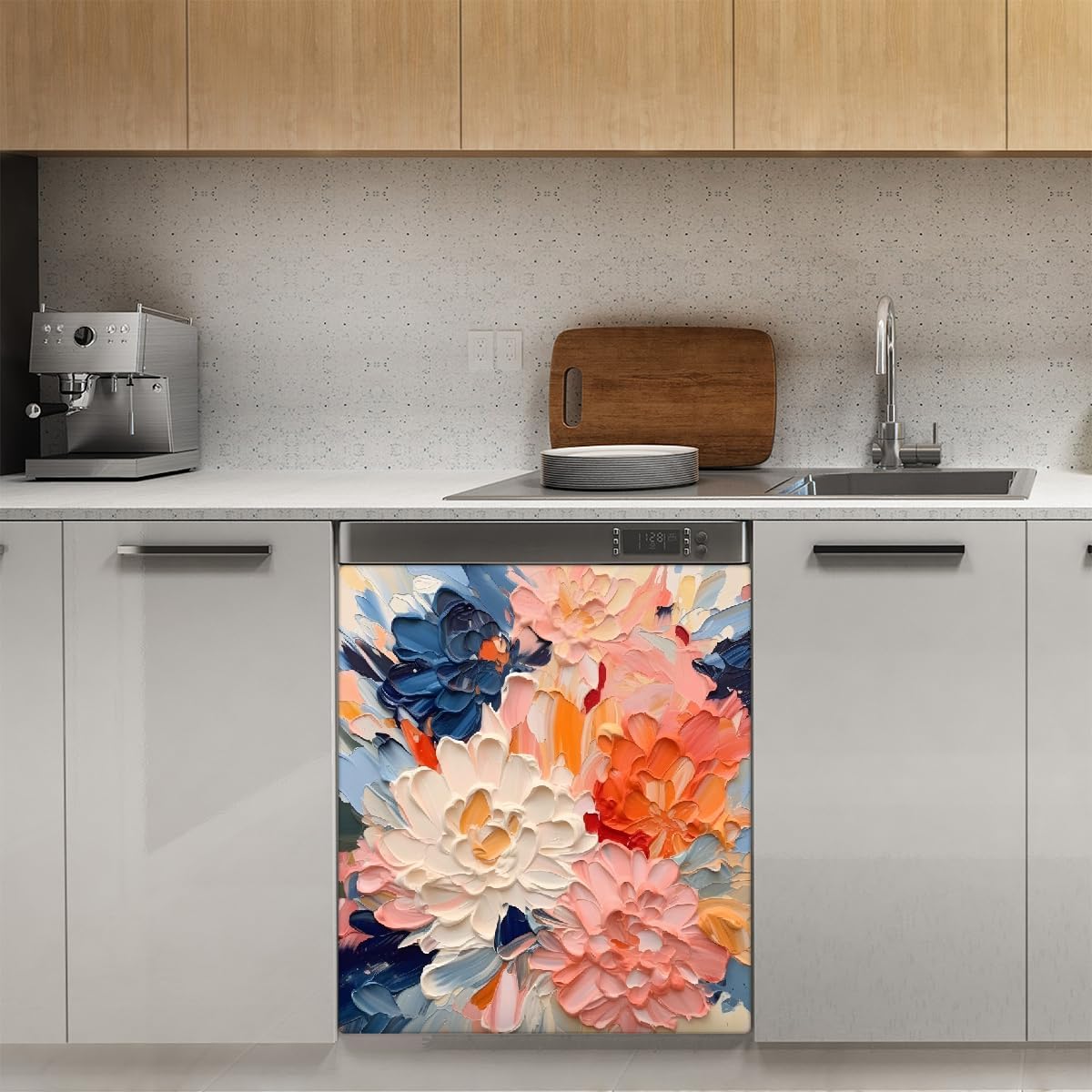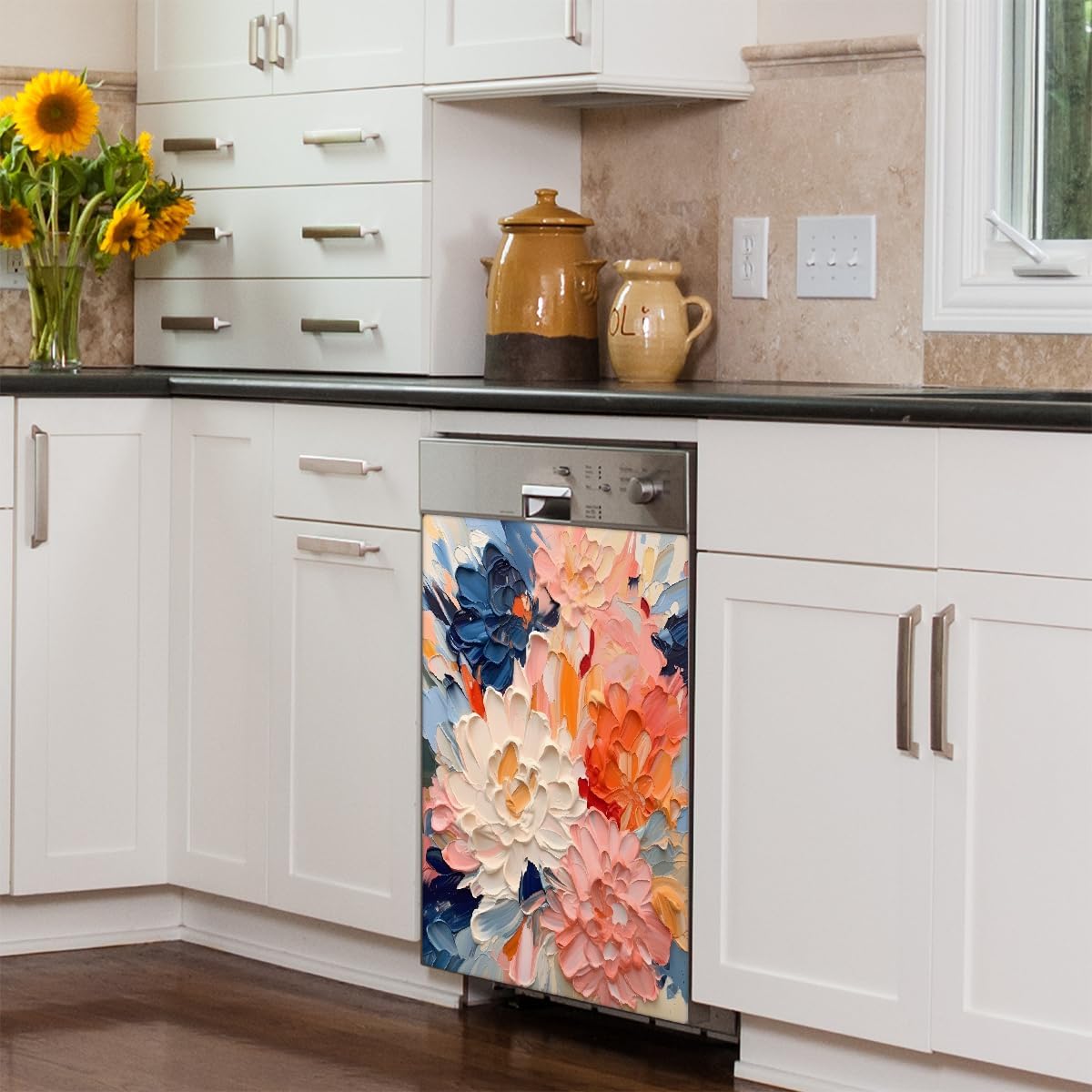Dishwasher Covers Refrigerator Magnetic Panel Decals Oil Painting Art Chrysanthemum Magnetic Sheet Sticker Wash Machine Fridge Panel Decal for Home Kitchen Decoration