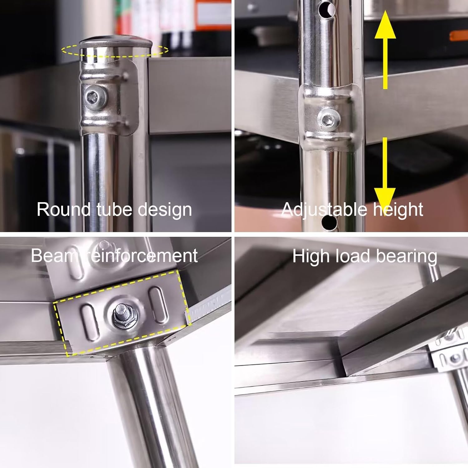 Thickened round tube designThickened round tube design, three-dimensional smoothAdjustable height, convenient storage3 levels of adjustable height, according to the size of the flexible height of the storageReinforced beams for high load bearingUniform force, stable storageWider design4 centimetre wider and thickerProduct Name:Working TableMaterial: stainless steelProduct Size:50x40x60 centimetre/19.7x15.7x23.6"50x50x60 centimetre/19.7x19.7x23.6"60x40x60 centimetre/23.6x15.7x23.6"60x50x60 centimetre/23.6x19.7x23.6"60x60x60 centimetre/23.6x23.6x23.6"70x40x60 centimetre/27.5x15.7x23.6"70x50x60 centimetre/27.5x19.7x23.6"70x60x60 centimetre/27.5x23.6x23.6"80x40x60 centimetre/31.5x15.7x23.6"80x50x60 centimetre/31.5x19.7x23.6"80x60x60 centimetre/31.5x23.6x23.6"Product content: workbench x 1, installation accessories x 1 (the rest of the items are not included in this product)Attention tips:1. Manual measurement may have error2. Due to different light, the product colour may have error3. Due to the stainless steel material, there may be slight scratches and welds