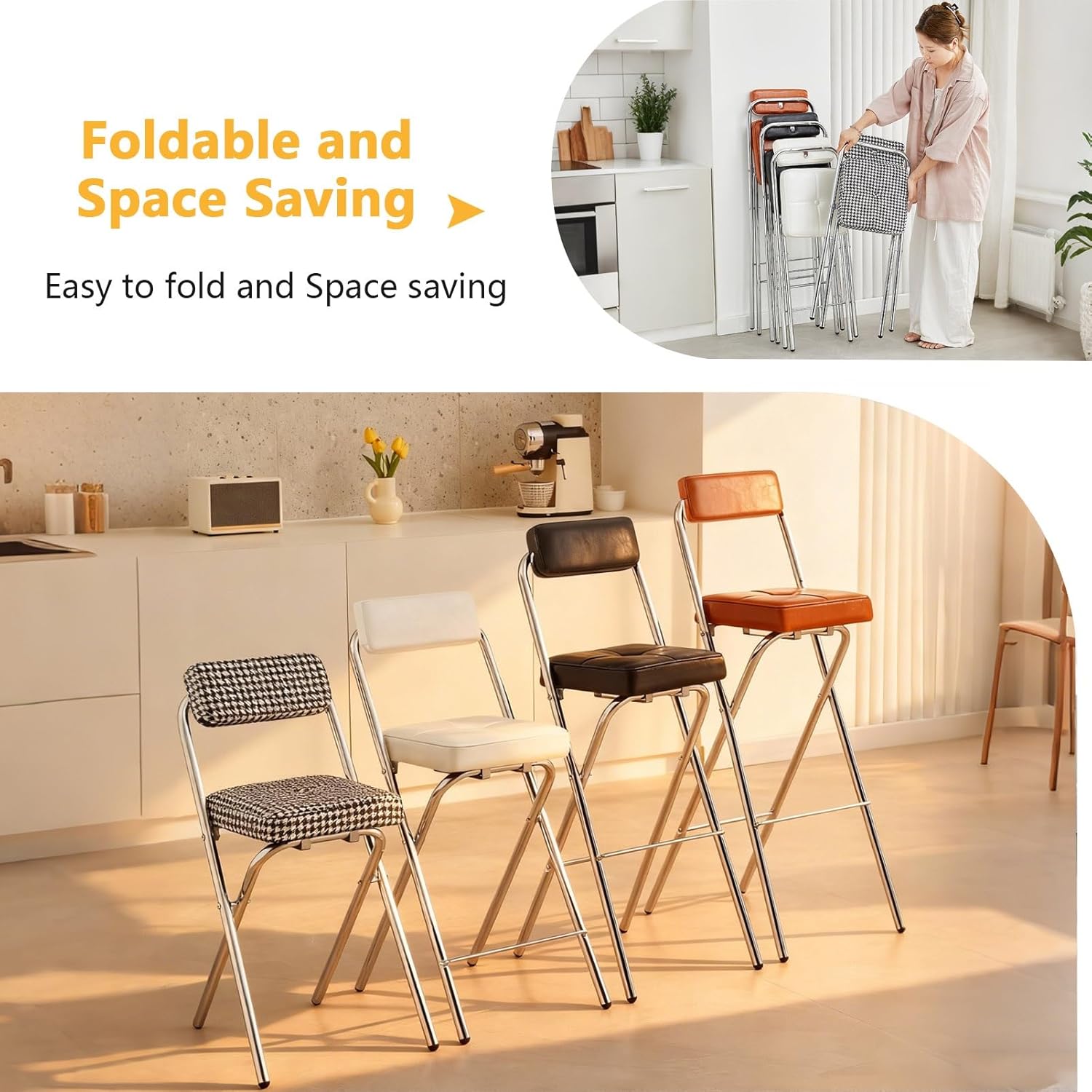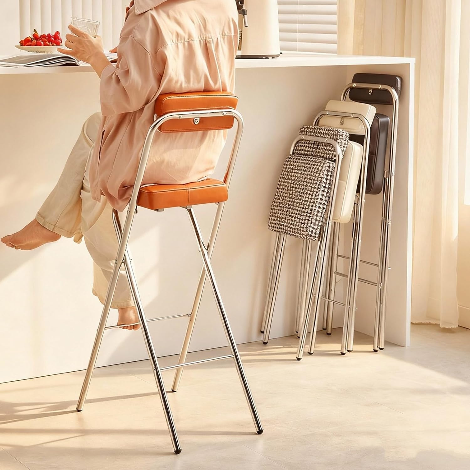 This folding bar stool with a backrest features a convenient collapsible design, simply unfold it, and it is ready for use. It is ideal for areas with limited space and for mobile work environments.Product Name: folding chairQuantity: 1Weight Capacity: 120kg per ChairFrame Color: SilverCushion and Backrest Color: Orange , Black , White , PlaidMain Materials: Carbon Steel + Sponge + Oil Wax LeatherWeight per Unit: 4kgPackage includes:1 x foldable bar stool