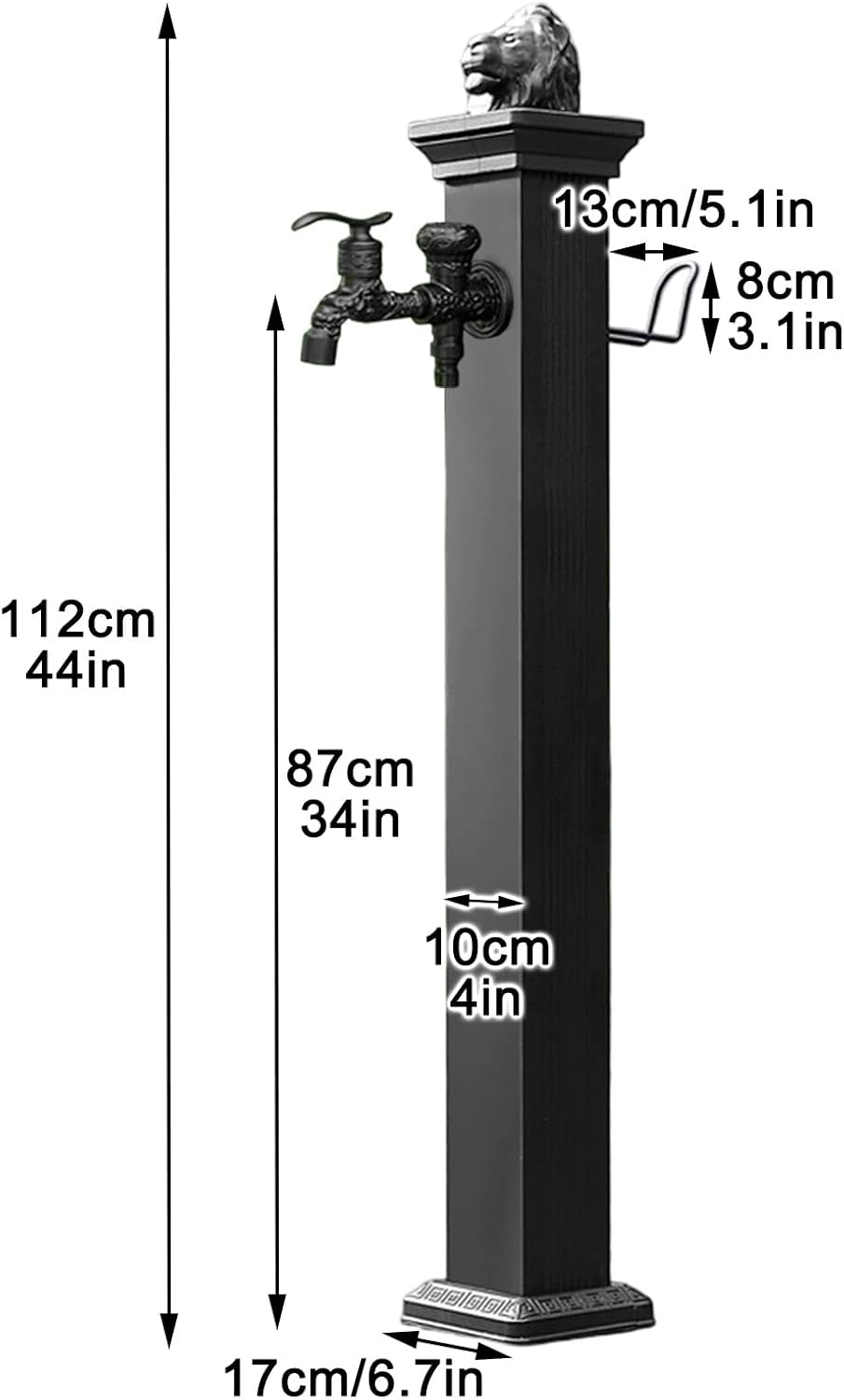 Our outdoor water column is designed for effortless connectivity to your water supply, ensuring a straightforward installation process. With the option to secure it to the floor using bolts or embed it for added stability, this fixture is built to last. The innovative internal antifreeze cotton structure offers superior insulation, protecting against freezing temperatures and harsh sunlight. This high-quality water column seamlessly blends with any garden décor, transforming your outdoor watering and gardening tasks into a hassle-free experience. **Product Description** - **Name:** Garden Hose Stand with Faucet / Outdoor Faucet Column - **Material:** Durable aluminum alloy - **Color:** Elegant black - **Height Options:** 72cm / 28in, 112cm / 44in - **Faucet Height from Ground:** 50cm / 20in, 87cm / 34in - **Column Width:** 10cm / 4in - **Decorative Cover Width:** 17cm / 6.7in - **Hook Size:** 13cm x 8cm / 5.1in x 3.1in - **Surface Finish:** High-temperature paint for long-lasting durability - **Installation Method:** Side entry or bottom entry for versatile placement - **Ideal Applications:** Perfect for villas, courtyards, lawns, gardens, schools, parks, workshops, and more **Packing List** - 1 x Water Column - 1 x Faucet - 1 x Storage Hook - 1 x Decorative Cover - 1 x Installation Accessories Enhance your outdoor space with our garden hose stand, designed for practicality and style, making it an essential addition for gardening enthusiasts and homeowners alike. Enjoy the convenience of easy access to water for all your outdoor needs!