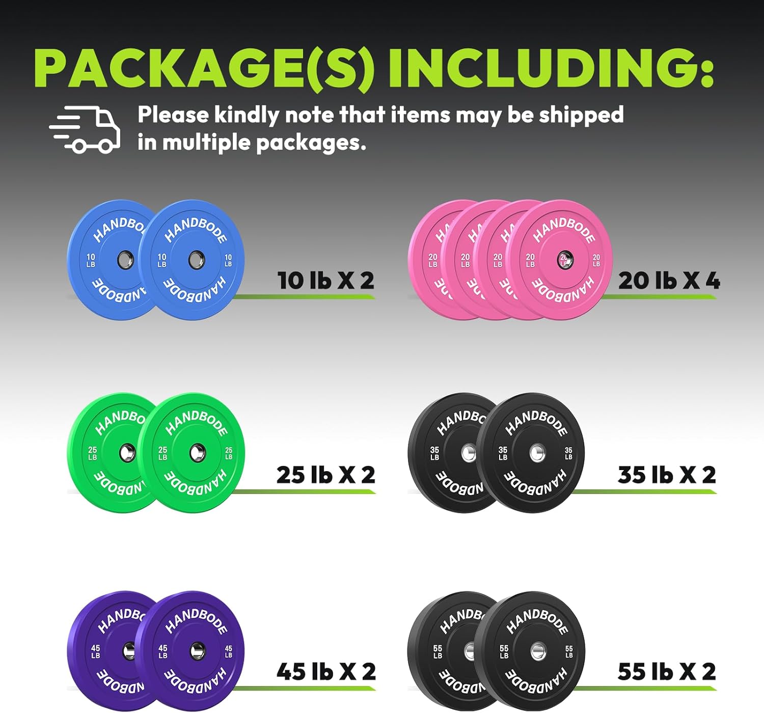 HANDBODE Crumb Bumper Plates Brand : HANDBODE Pounds or Kilograms : Pounds Weight Increments : 10/15/20/25/30/35/40/45/50/55 Plate Diameter : 17.7"/450mm Center Hole Diameter : 2"/50mm Inserts Material : Stainless Steel Plate Material : Crumb Rubber Durometer Rating : 72 ~ 75 Weight Tolerance : 2% Rubber to protect floor or bar Color-coded plate for quick identification Traditional steel plates are noisy and cannot be dropped during intense workouts or Olympic weightlifting sessions. You can drop bumper plates on the floor without damaging the plate, barbell, or floor, because they are constructed with rubber around a central metal hub. Crumb rubber's hardness rating is less than virgin rubber, it is lands softer. The Plates are coor-coded for quick identification and pick up. Crumb bumper plates are made from recycled rubber, making them an environmentally conscious choice. By using recycled materials, these plates help reduce waste and give new life to old rubber tires. If you have a home gym and want to avoid disturbing your family or neighbors, crumb bumper plates are a great choice. Their shock-absorbing properties and reduced noise levels make them ideal for a residential setting, Their ability to withstand drops and provide a bit of bounce is perfect for those explosive movements and dynamic lifts that are the heart and soul of your workout of the day.