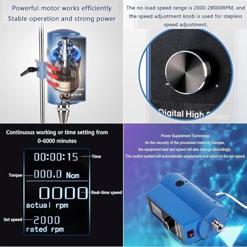 Introducing the Laboratory Dispersing Homogenizer, your go-to high-speed emulsifier tailored for diverse laboratory applications such as cosmetics formulation, paint mixing, and various emulsification processes. Engineered for precision, this advanced blender features a digital display with adjustable speeds ranging from 2000 to 28000 RPM, powered by a robust 500W motor that guarantees efficient mixing and dispersion for your projects. Crafted with a stainless steel working head, this homogenizer not only offers excellent corrosion resistance but also ensures easy disassembly for convenient cleaning and maintenance. Its adjustable height feature enhances versatility, making it suitable for different experimental setups, whether you are working with small samples or larger batches. Available working head models include the Buckle model (12G, 18G, 28G, 36G) and the Spiral model (28F, 36F, 50F), allowing you to select the perfect fit for your specific needs. Specifications include: - Model Name: Laboratory High-Speed Dispersing Homogenizer Emulsifier - Power Supply: 110/220V, 60/50Hz - Power: 500W - Processing Capacity: 50-2000 ml - Speed Range: 2000-28000 RPM - Speed Display: LCD - Speed Control: Stepless regulation - Timing Control: Up to 6000 minutes - Torque Display: Yes - Working Head Material: SS304 - Shell Material: PTFE - Standard Working Head Type: Shear type - Number of Standard Working Heads: 1 - Maximum Working Temperature: 120°C - Allowable Ambient Temperature: 5-40°C - Allowable Relative Humidity: 80% - Included Accessories: Working bracket and base - Weight: Approximately 9 kg Package Includes: - 1 high-speed homogenizer - 1 cutter head (optional) Elevate your laboratory capabilities with the Laboratory Dispersing Homogenizer, designed for performance and reliability, ensuring your emulsification tasks are executed with precision and ease.