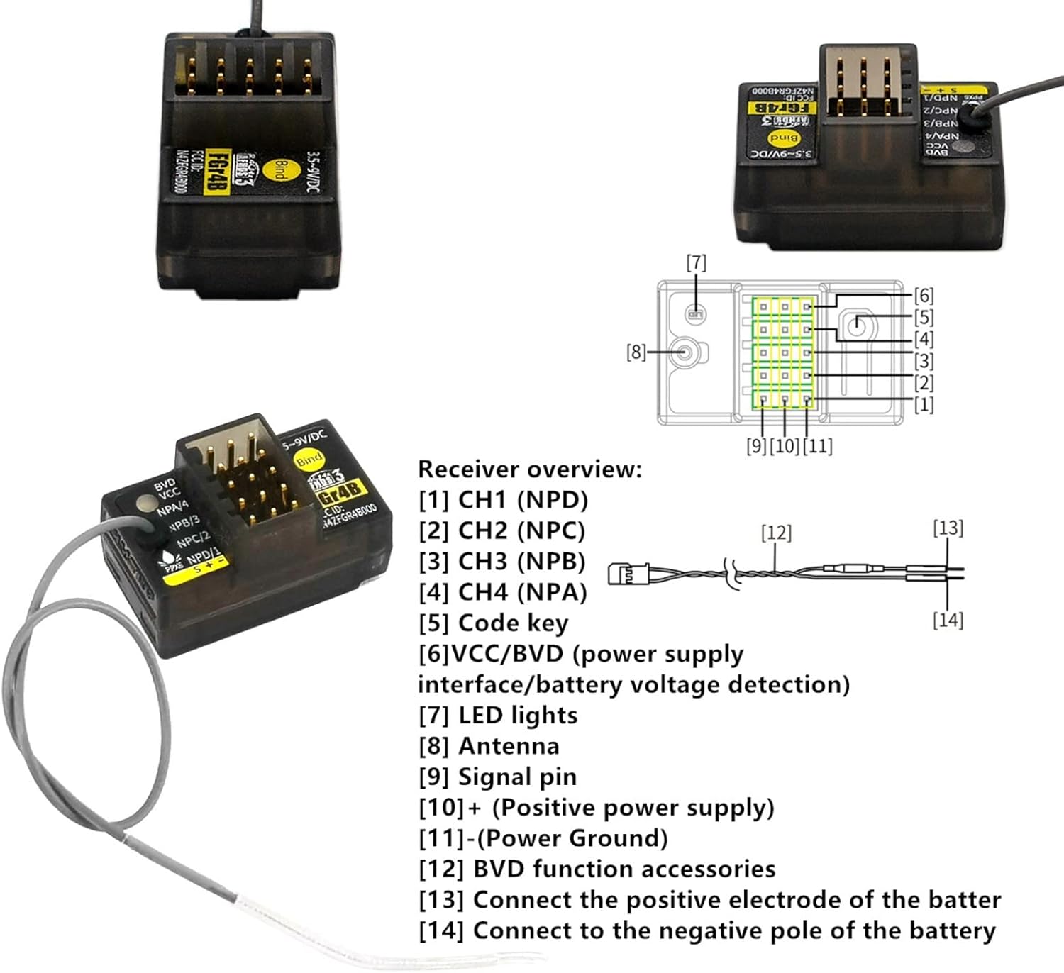 The FGr4B receiver is compatible with all AFHDS 3 transmitters (Note: It is currently applicable to PL18 1.0.55, NB4 2.0.93 and NB4 lite 1.0.10 and later versions. The high-frequency library used by the firmware is version 3.0).Binding ✔ Press and hold the receiver BIND button [5] while powering on the receiver, release the BIND button after receiver is powered on or powering on the receiver first, press and hold the BIND button 3 seconds , the LED [7] on the receiver will flash rapidly✔Put the transmitter into bind mode✔The binding process is complete when the LED on the receiver stops flashing and is on continuously.If a transmitter that has had its radio frequency (RF Standard) set to “AFHDS3 1 way” (please refer to your transmitter user manual) enters bind mode, the receiver LED will instead flash slowly. Exit bind mode on the transmitter and if the receiver LED stops flashing and is on continuously, the binding process is complete.✔Check to make sure the transmitter and receiver functions are working correctly, repeat steps 1 to 3 (binding process) if any problems arise.Product Designation: FGr4B Compatible transmitters:all AFHDS 3 transmitters and RF Modules (PL18, Paladin EV, NB4, NB4 Lite, etc.)Model Type: Car/boat etc PWM Channels: 4 RF: 2.4GHzProtocol: AFHDS 3 Antenna:Dual Antennas Input Power:3.5-9VData Output: PWM/PPM/i.BUS out/S.BUSTemperature Range: -10℃ to +60℃Humidity Limit: 20%-95%Online Update:YesDimensions: 17*29*16mm Weight: 6.4gPackage Included:1 x FGr4B Receiver