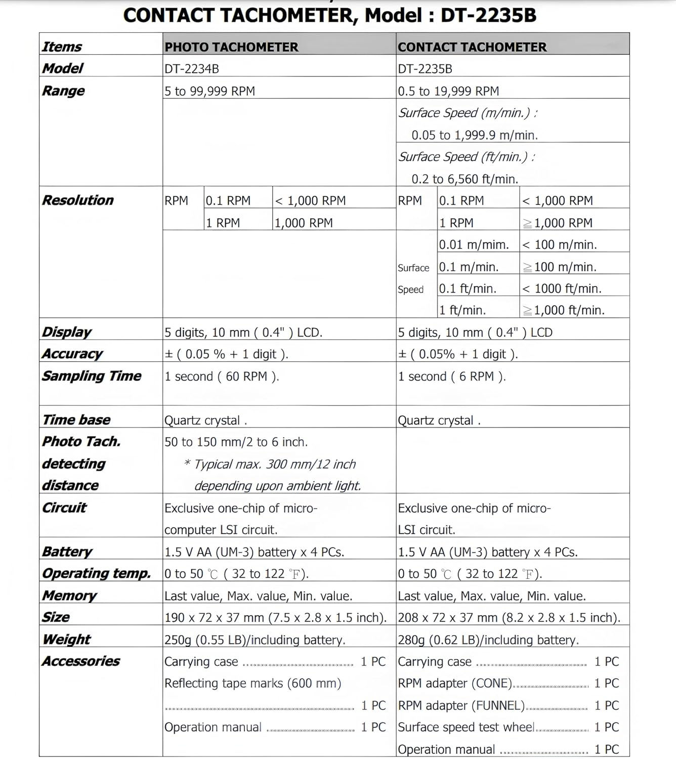 i-POOK LASER PHOTO TACHOMETER DT-2234B Measures RPM from 5 to 99,999 accuracy of ±(0.05% + 1 digit) Resolution 0.1 RPM With Memory Last value, Max value, Min value High quality made in Taiwan