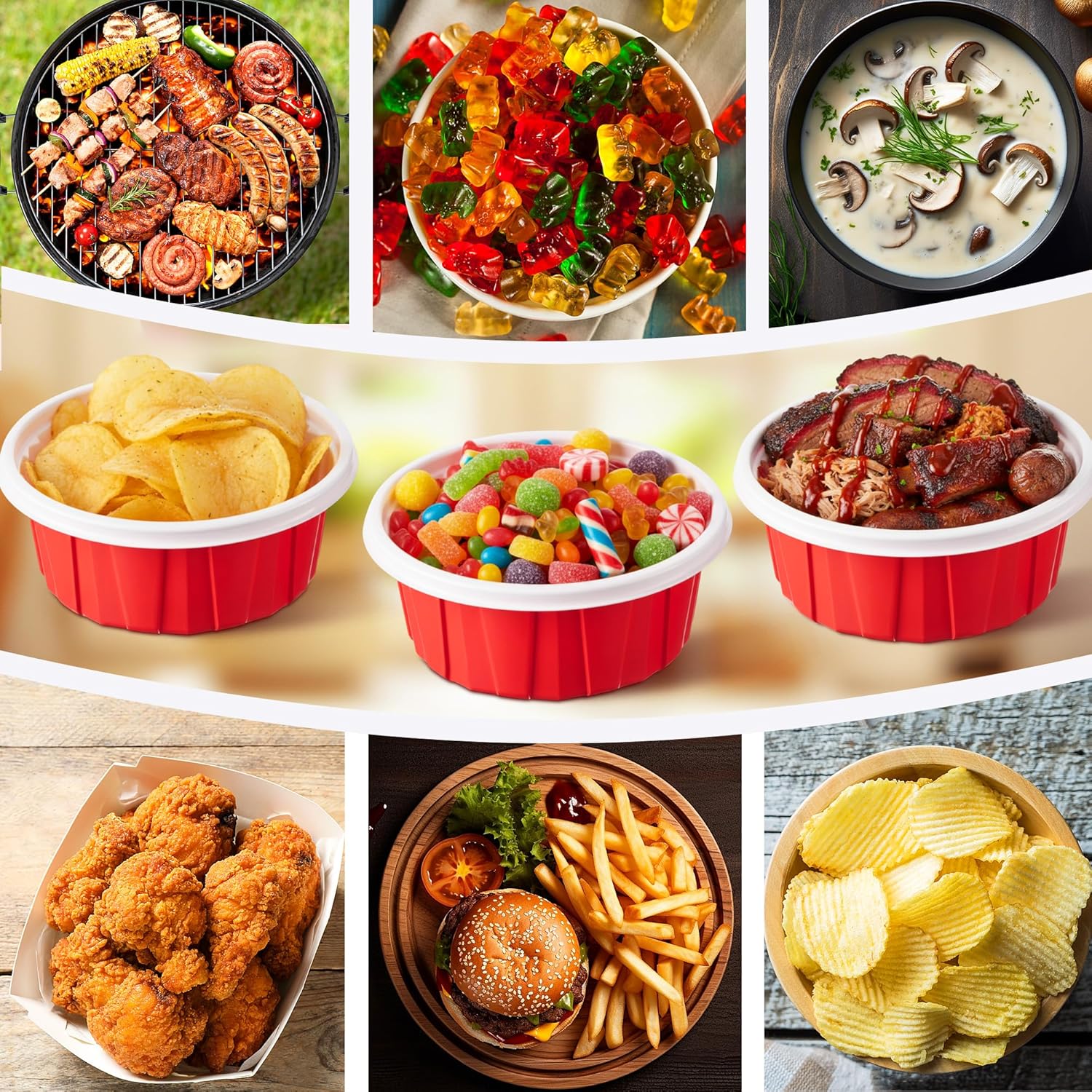 Features: These disposable serving bowls, with their chic design, pair perfectly with red party cups and bring joy to any gathering. Made of durable plastic, they're stronger and more durable than paper alternatives. They can be discarded after use, eliminating the need for messy cleanup. Specifications: Material: plastic Color: red Size: 22 oz Package includes: 100 x red party cup bowls Notes: Manual measurement, please allow slight errors on size. The color may exist a slight difference due to different screen displays.