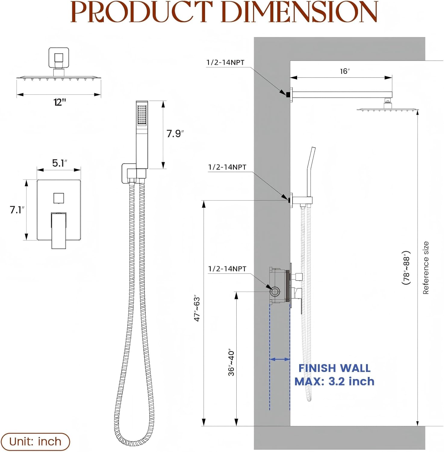 | Included Components | 12 Inch Rain Shower Head, 16 Inch Wall Mounted Shower Arm, Adjustable Shower Bracket, Handheld Shower Head, Shower Mixer Valve with Trims |
