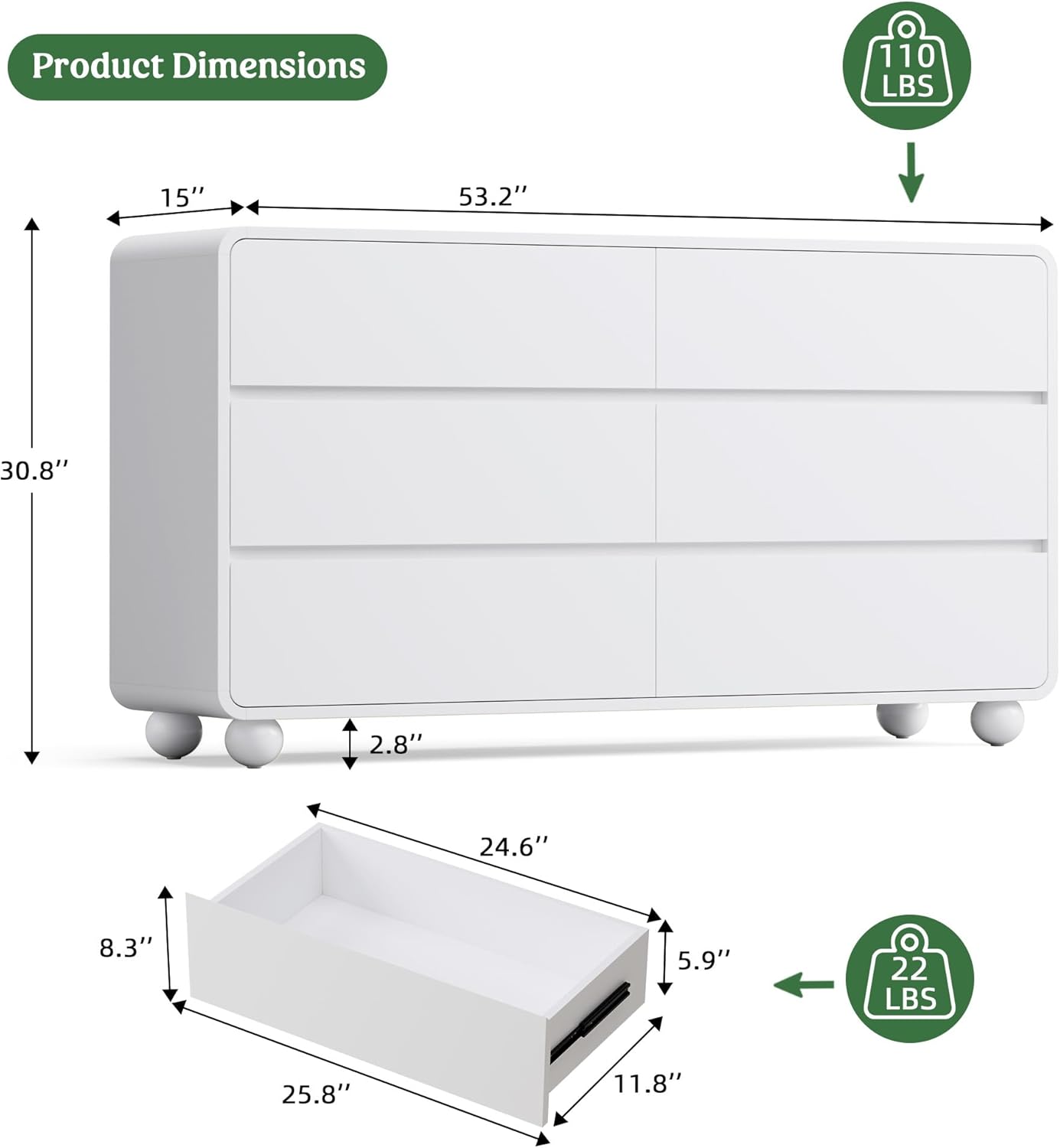 Ample Storage Space Wide wooden top can hold your lamp, photos and flower, the 6 large drawers provide enough storage space for clothes, books and all your bedtime items, keep your items organized and room tidy! Name: Wood 6 drawer dresser cabinet with storage drawers storage for bedroom entryway closet living room apartment furniture Colors: White Natural Black dresser organizer clothes Dresser Size: 53.2" X 15" X 30.8" Drawers Size:25.8 X 11.8" X 5.9" Number of drawers: 6 Drawers Brand: Lulive Application Scenario: home office, bedroom dresser, kitchen, craft Room, children's room, wardrobe, study/work area, Living room, Cloakroom, closet, bedside table, utility room, vestibule, corridor, entrance, corner, Youth apartment Applicable Population: women, men, teenagers, college students, renters Material: wood, Metal rail, Our wooden dressers & chests of drawers combine elegance with versatility, transforming your living space with its timeless. The small dresser offers ample storage with six large drawers for clothes, towels, and more, while the spacious top organizes skincare, cosmetics, and jewelry. Crafted with FSC-certified wood panels for superior safety, the drawers for the bedroom feature anti-tip hardware and tapered legs for stability, supporting up to 133 LBS. Its 3-section fold slides design allows for easy drawer access, and bedroom dressers are set with smooth and silent glides thanks to the ball-bearing mechanism. Bedroom dressers with drawers are easy to assemble with detailed instructions and a video guide, this dresser is perfect for your bedroom, living room, or entryway, and can even be used as a TV stand. Tall dressers for bedroom wood dressers for bedroom adult teen women teenagers.