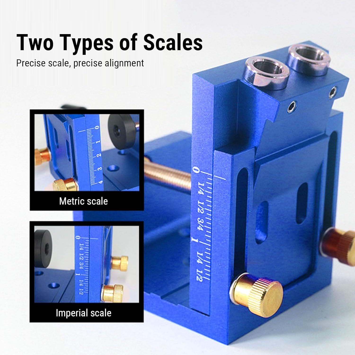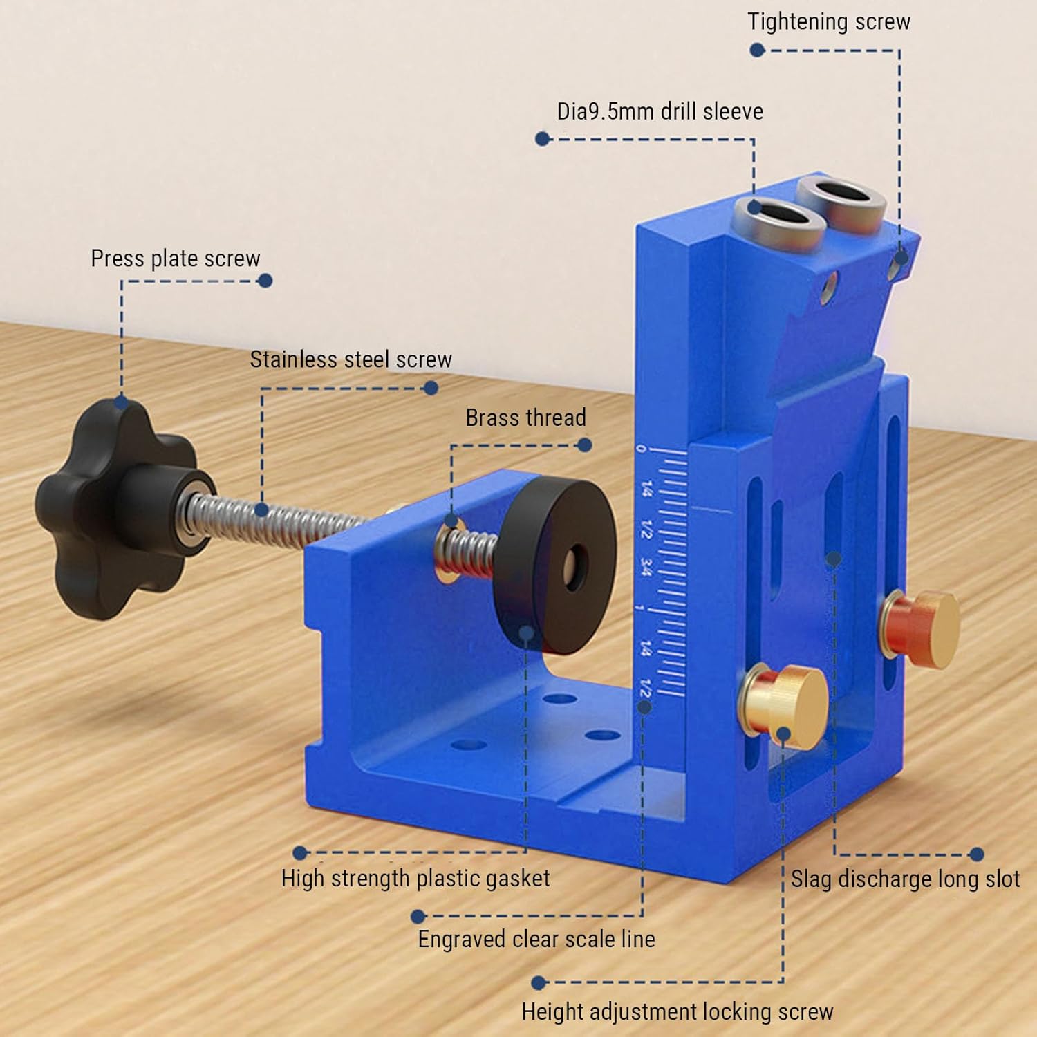 Spec: Item Type: Pocket Hole Jig Kit Material: Aluminum Alloy Drill Bit Size: Approx. 9.5mm / 3/8in Color: Blue PackageList: 1 x Pocket Hole Jig 1 x Screwdriver Bit 2 x Drill Bits 2 x Limiters 1 x Wrench 10 x Screws 10 x Accessories 1 x Instruction Manual