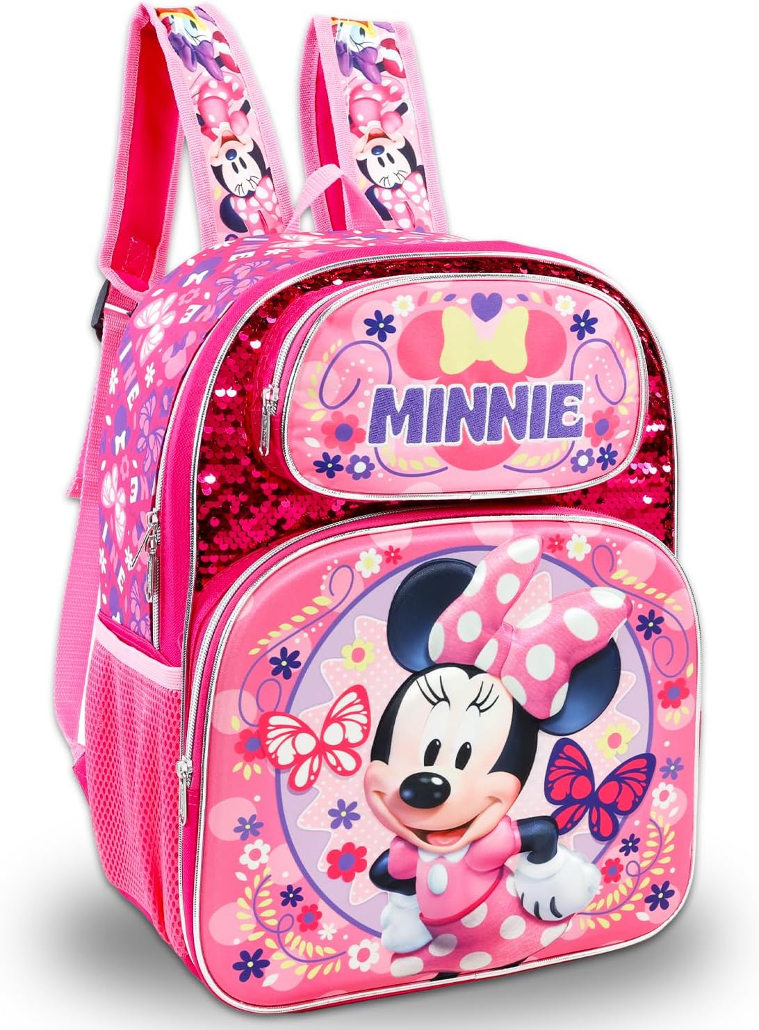 Minnie Mouse School Backpack for Girls - Bundle with 16” Disney Sequin School Bag Plus Water Bottle, Stickers, More | Minnie Mouse School Supplies for Kids. This Minnie Mouse sequin backpack has adjustable straps, a zip closure, and a top loop, featuring colorful artwork of Minnie Mouse. The backpack measures approximately 16" x 12" x 5". It has plenty of space for Minnie Mouse folders, notebooks, and books, making it a great option to carry your Disney items anywhere you go. This durable Minnie Mouse backpack for girls also includes Minnie Mouse stickers, a pink Beach Kids water bottle, and a Beach Kids princess door hanger. Officially licensed Minnie Mouse backpack school set for kids. Pair this with other Disney school supplies. WARNING: CHOKING HAZARD—Small parts. Not for children under 3 years or 36 months.