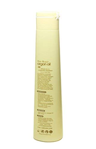 HYDRATING SHAMPOO HAIR REPAIR ARGAN OIL 5+ Argan oil treatment 100% sulfate paraben free Mild wash scalp balance Anti-hair loss Anti-dandruff FOR ALL HAIR TYPES Description For weightless rehydration, designed to rebalance the hair's moisture level. Damage hair is repaired and regains softness, suppleness and shine. The innovative ultra hydrating formulas offer extraordinary superior hydration. Recharge the hair with natural argan oil moisture without overburdening it. For soft, supple and nourished hair, full of healthy shine and vitality.