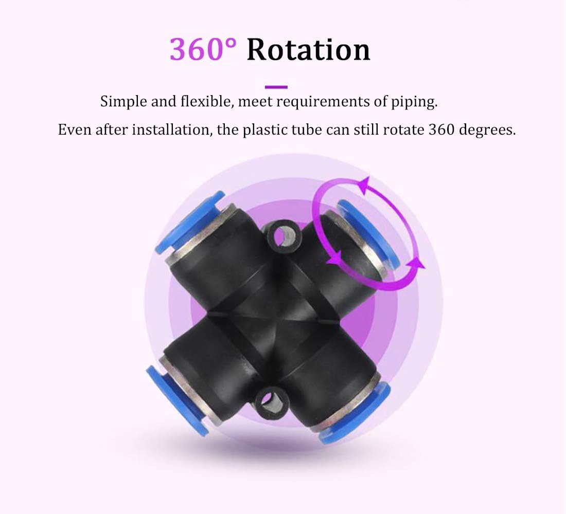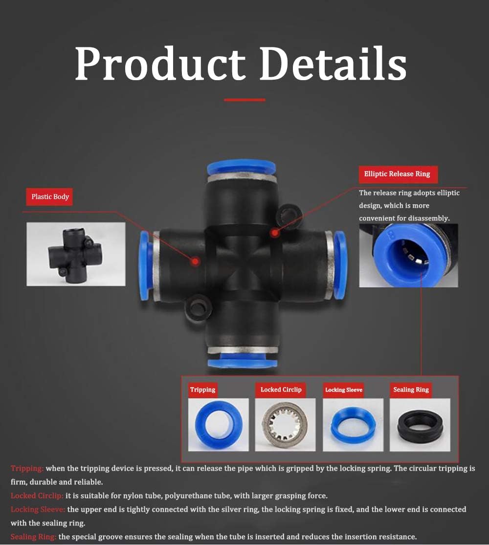 Specification: Product Name: Cross Union Push Fitting Model: PZA-4 Size: 45mm x 45mm x 14mm/ 1.77” x 1.77” x 0.55” (L*W*H) Operating Pressure: 0-0.9MPa Limiting Pressure: 1.32MPa Operating Temperature: 0-60 Degree Celsius Three Tube Size (OD): 4mm(5/32”) Color: Black, Blue Material: Plastic Installation: 1. Cut the pipe flat without slope. 2. When inserting the pipe into the connector, it must be inserted into the end, otherwise leakage may occur. 3. After inserting, try to pull out the tube. If it can't be pulled out, it means it is connected. 4. When loosening the tube, first confirm that the tube is not under pressure and then press the end cap evenly to the bottom. Package Content: 20Pcs of PZA-4 Cross Union Push Fitting