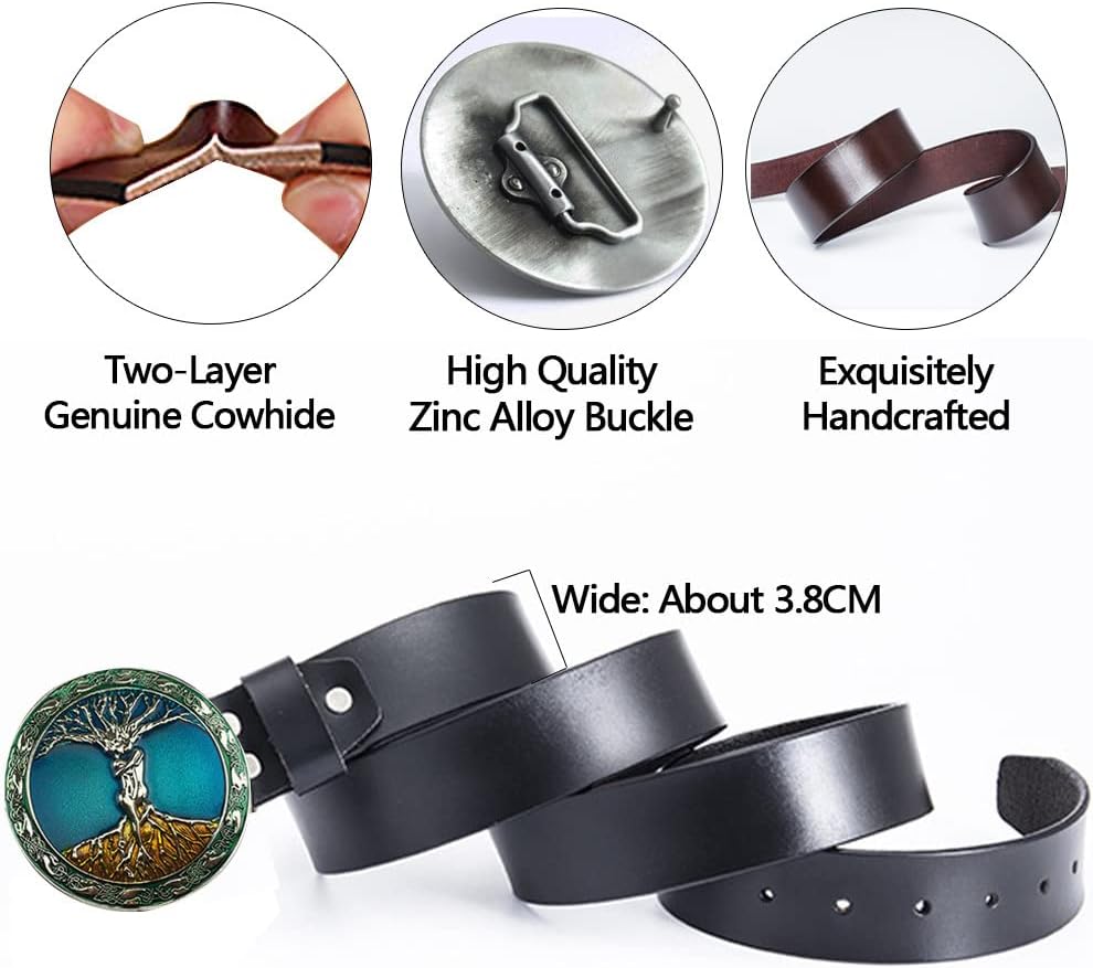 The Nordic Viking tree of life zinc alloy belt buckle is the eye-catching feature of each belt, and it also represents the wearer's hobby to a certain extent. TREE OF LIFE UNIQUE DESIGN: Yggdrasil, known as the Tree of Life or the World Tree, is one of the most prominent Norse symbols. The Great Tree of Life symbolises faith, interconnectedness, love, protection, strength, wisdom, and justice.★for those who dig odin, nordic myth, runes, skulls, valhalla, germanic tribes, metal music culture. Get yours now! ●Handmade-Just the right amount of heft and a very smart hand to make this leather belt.●Vintage Style- Snap on design for easy replacing buckles, you can replace any style buckle as you like.●Fit Type-For people: Men, Women, Teenager, Office Worker.Belt Buckles Color: Silver Plated/Gold Plated /MulticolourBelt Color: Black/BrownBelt Width: 3.8CMBelt Length: 100CM , 105CM , 110CM , 115CM , 120CM , 125CM , 130CM , 90CM , 95CMHow to correctly measure the belt that suits you!Measure the distance from the pin or pin of the belt buckle to the hole you use!Down to 0 or 5-or round up. Example: Your measurement result is 93 cm. You order 90 cm or 95 cm. Both are suitable.Note: Do not measure the total length of the belt! !What You Get:1Pcs* Viking Belt Buckles1Pcs* Belt