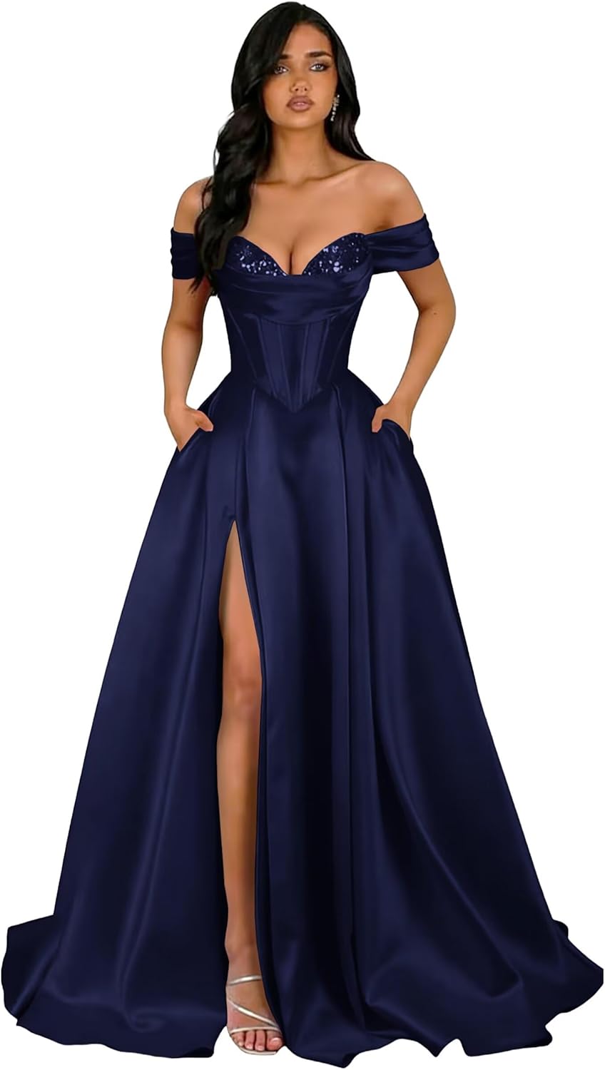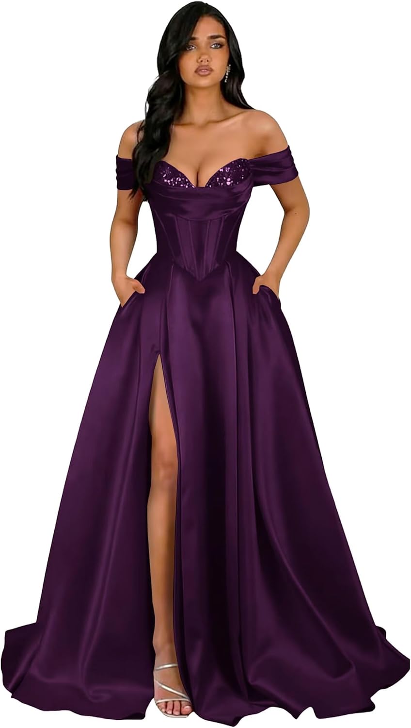 | Fabric Type | Long Sequin Satin Off the Shoulder Slit A Line Prom Dress with Pockets |