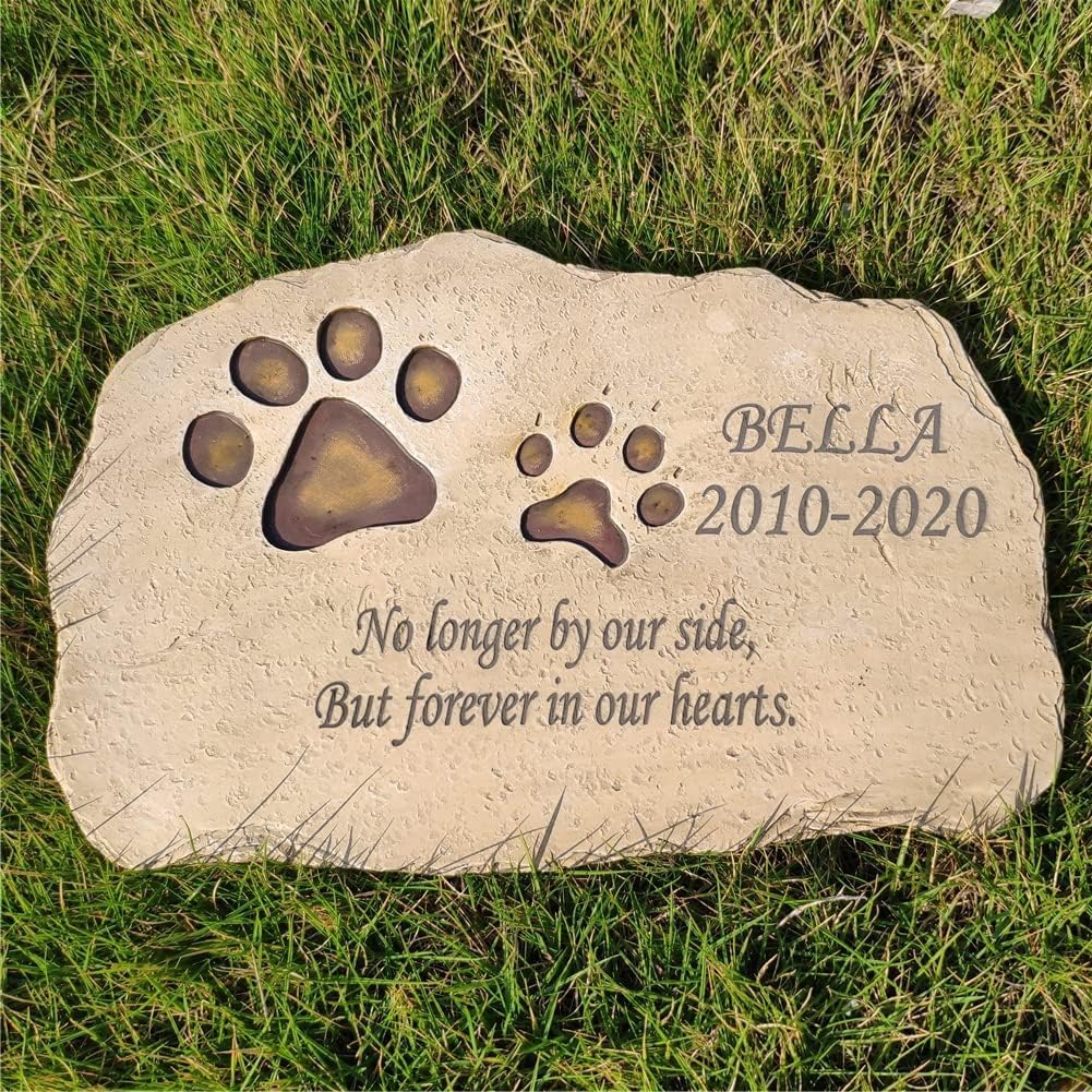 A surprising pet dog loss memorial gift: Express your sincere emotions the pet memorial stone is a perfect gift to express sympathy comfort remembrance healing.This beautiful pet memorial stone helps a sad friend or loved one remember their special furry friend. 1. Perfect Design: Big showy Paw prints on the stone keeps you and your pet together in spirit forever. 2. Customized including pet's name born passed dates and one touching sentence you most want to say to your pet. Laser engraved and then hand paint it with water-resistant paint will last forever. 3. Measurement: The size of the pet dog grave marker is 11x 7.5 x 0.6 inches and weight 1.4 pounds It's easy to be found even outdoors. 4. Material: The pet dog garden stone is poured with high quality resin and hand-painted with environmentally friendly paint sun-resistant and waterproof hard to be damaged suitable for indoors and outdoors. 5. Well-packed protected with special materials there is absolutely no need to worry about damage during transportation nice pet dog loss gift. NOTE: Please reconfirm the personalization information before placing the order.