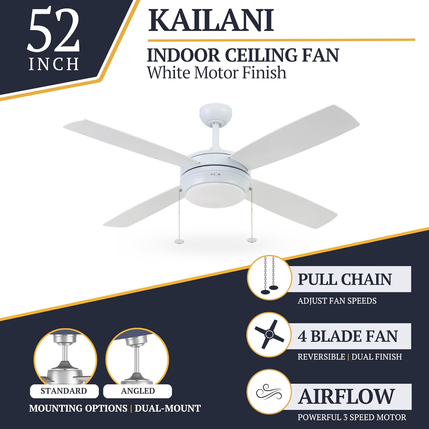A gorgeous, modern ceiling fan with mass appeal, the 52-inch Prominence Home Kailani fits flawlessly in your trendy spaces. This contemporary fan features a striking contoured body with a beautiful bright white finish and four clean-lined, reversible blades with a different finish on each side. One side comes in a crisp white finish that pairs well with both coastal and modern decor, while the other side showcases a white maple finish which harmonizes well with many styles. Its spherical housing features a powerful integrated LED light with the lumens to light up a room but dimmable to create the perfect ambiance for your mood. The robust motor and design provide adjustable, reversible air movement that is ultra-efficient whether you want to cool down on those sweltering summer days or circulate warm air in the cold months of winter. Pull Chains are included for quick and easy on and off adjustments. This fan is also compatible with universal ceiling fan remote controls (sold separately). To ensure your long-term satisfaction, this fan is backed by a limited lifetime warranty. The Prominence Home Kailani gives you all the quality functions you deserve while providing the impressive eye-catching style you crave.