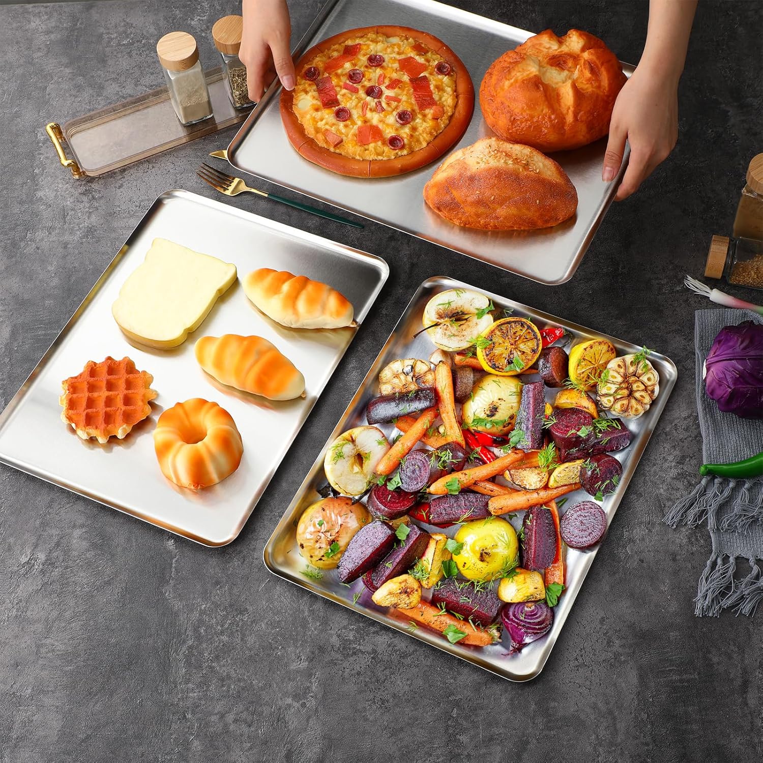Features: You will receive 6 pack stainless steel trays, enough Rectangular Trays with smooth appearance and classic colors can not only be applied to hold items, but also add a touch of elegance to your bedroom/table/bathroom clutter, making the space look organized, clean and tidy This decorative tray is not only suitable for placing spoons for cooking, and can also store your most commonly applied spices, seasonings, and condiments, keeping your kitchen organized. The tray is also suitable for storing perfume, jewelry, cosmetics or hand sanitizer in the vanity or bathroom Specifications: Material: stainless steel Color: sliver Size: 16 x 12 Inch Package includes: 6 x Stainless steel trays Notes: Manual measurement, please allow slight errors on size. The color may exist a slight difference due to different screen displays