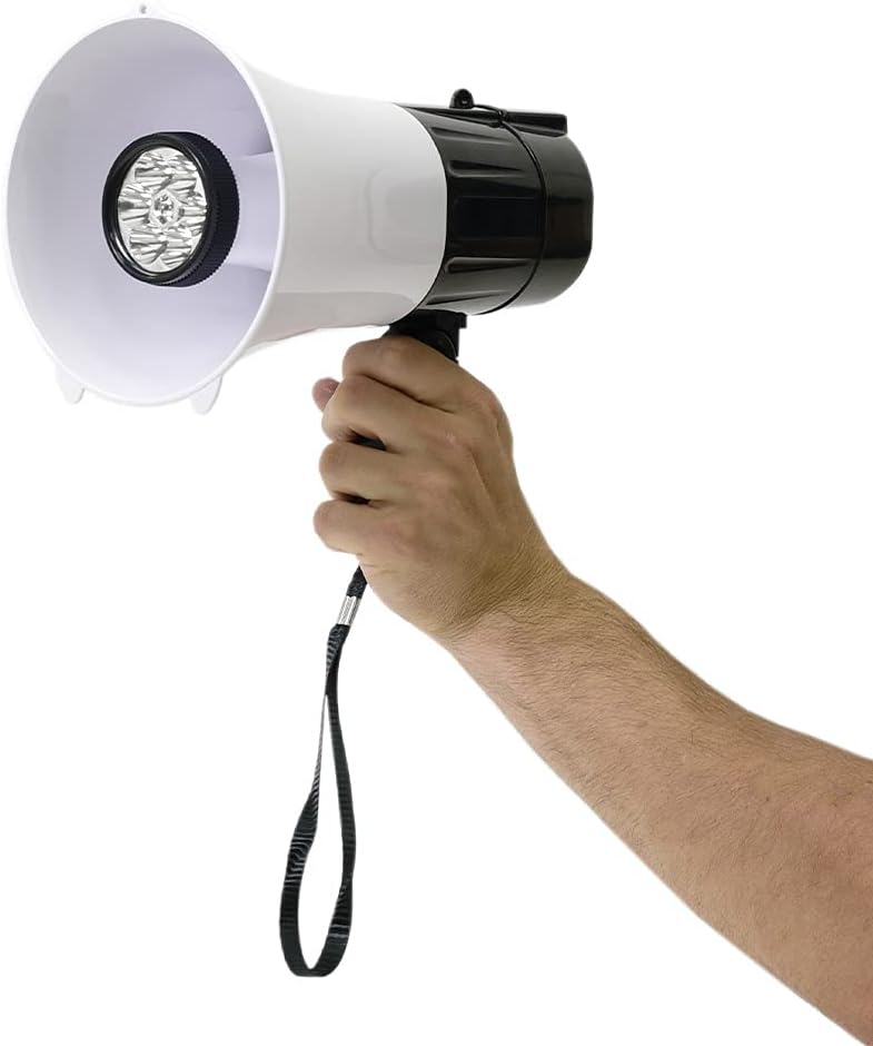 Compactâ Portable Megaphone with LED Lights & Siren Features: Model: SA-MEGA10 Compact size with clear loud sound Lightweight and portable, perfect for indoor/outdoor sporting events, safety drills and crowd control. Foldable Pistol Grip Talk Button Siren Button LED Light Button Microphone Volume Control Built-in Microphone ABS Plastic Construction Favorable Range: Over 400 Yards Carrying Strap Technical Information: Requires 4 (Size C) batteries (not included) Rated Power - 10 Watts Overall Length: 10¢â¬Å¡Â¬ï¿½ Bell Width:â 6¢â¬Å¡Â¬ï¿½ CLICK HERE to Download USER MANUAL The Seismic Audio SA-MEGA10 Lightweight Portable Megaphone with Siren is perfect for projecting your voice inside of large rooms or outdoors. It is lightweight and easy to carry and handle. The SA-MEGA10 will project your voice over 400 yards just by pressing the ON button. It has a built-in microphone and has convenient volume control so that you can be as loud as the application demands. This SA-MEGA10 has built-in LED lights and also has a siren function so that you can get everyone's attention when you want it. The SA-MEGA10 Megaphone is a perfect solution for referees, police, firefighters, and anywhere voice amplification is needed! The Seismic Audio brand was designed with the notion that every musician should have access to high-quality Pro Audio gear at an affordable price! With your purchase. you will receive one megaphone pictured and described above.âÂ