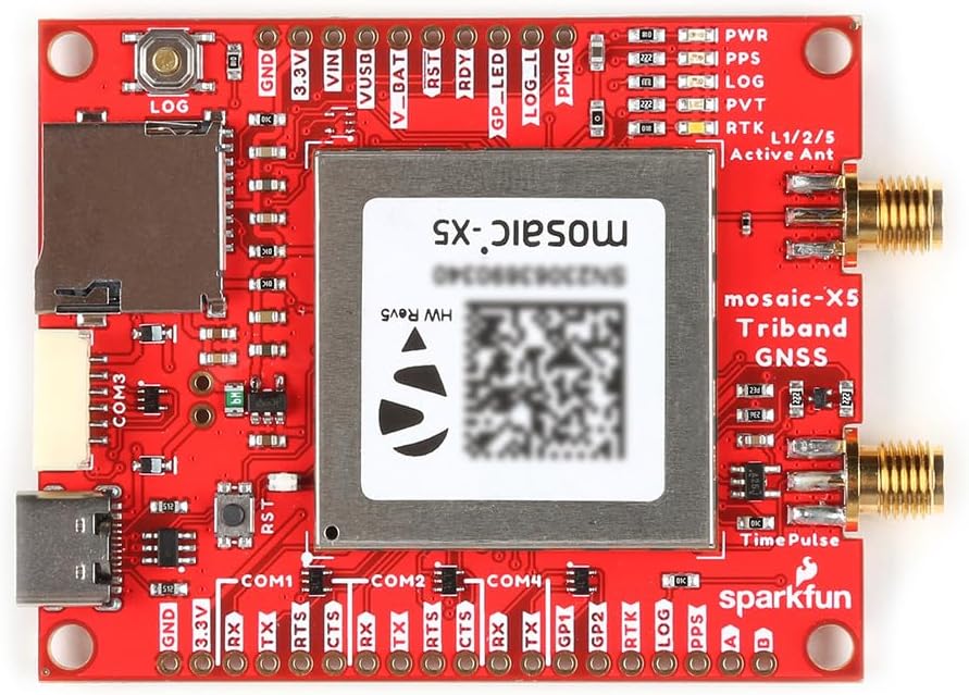 We see new iterations with GNSS with each passing year, and with the SparkFun mosaic-X5 Triband GNSS RTK Breakout, you'll be provided with the easiest way to start using L1, L2, and L5 bands simultaneously! At the heart of the Triband GNSS RTK Breakout is Septentrio's most compact high-precision GNSS receiver, the mosaic-X5. The mosaic-X5 module is an ultra-low power, multi-band, multi-constellation GNSS receiver capable of delivering centimeter-level precision at high update rates. The receiver supports the GPS (USA), GLONASS (Russia), Beidou (China), Galileo (Europe), and NavIC (India) constellations, including regional systems (i.e. SBAS and QZSS). It also features Septentrio's unique AIM+ technology for interference mitigation and anti-spoofing, ensuring best-in-class reliability and scalable position accuracy. With its Real Time Kinematics (RTK) capabilities, the mosaic-X5 module can operate as a base station to broadcast RTK correction data or as a rover utilizing RTK correction data to record positions with extreme precision. The module can achieve a horizontal accuracy of 6mm (~0.25in), vertical accuracy of 1cm (~0.4in) using RTK, and timing precision of 5ns (5 billionths of a second). The mosaic-X5 is compatible with RTK correction data from various 3rd-party services. The mosaic-X5 can also deliver position updates at 100Hz (100 times per second) for automotive and industrial applications. The mosaic-X5 is a sophisticated chip running an internal web server that can be accessed through the USB interface with a standard browser using a Linux/Windows computer. Septentrio also provides dozens of video tutorials to guide users through the configuration settings of their GNSS receivers utilizing the web interface. In addition to the module's web interface, Septentrio provides software packages where users can post-process recorded data, configure the mosaic-X5 module, and analyze the receiver's performance or the GNSS signals for interference/spoofing. If these interface options weren't enough, Septentrio's GNSS modules are compatible with other 3rd-party software packages.