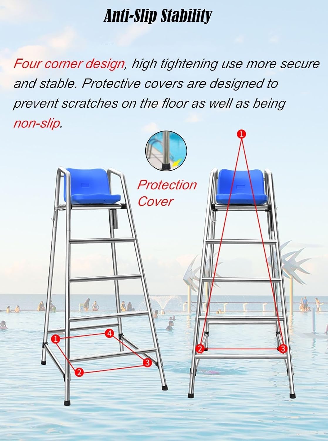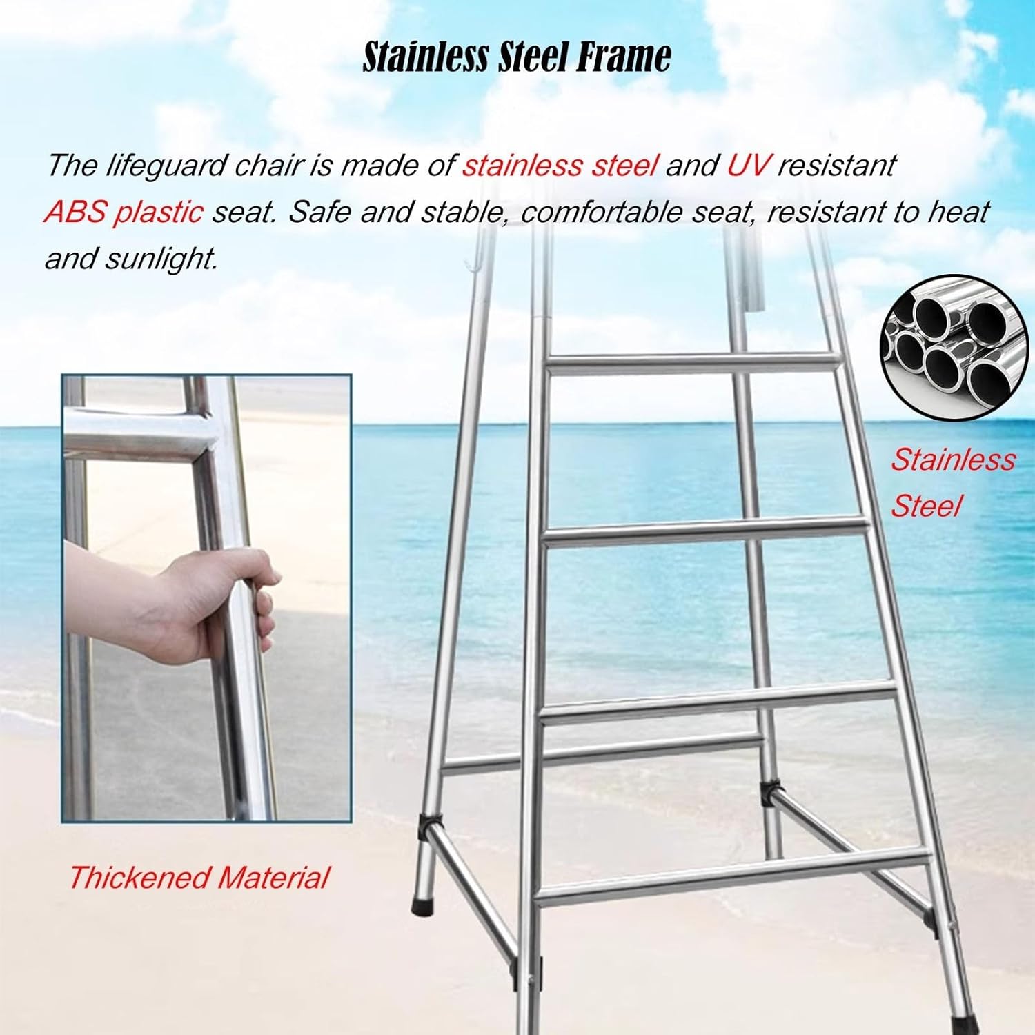 Heavy-Duty Stainless Steel Deck Chairs:A lifeguard chair is one of the safety features of a swimming pool. The lifeguard sits on it and overlooks the whole pool to ensure the safety of all swimmers. Our detachable lifeguard chair is easy to store. Made of high quality 304 stainless steel, sturdy and durable. ABS base is solid and stable, not easy to deform, comfortable to sit on. Specification : - Material: 304 stainless steel + ABS plastic seat - Tube Diameter: 38mm/1.5in - Tube Thickness: 1mm/0.04in - Number of Steps: 2/3/4 steps - Weight Capacity: 300 kg/660 lbs - Height: 120cm/47.2 in , 150cm/59.1 in , 180cm/70.9 in - Seat Dimensions: 41x32x30 cm/16x12.6x11.8 in - Weight: H120cm - 13.4kg/29.5 lbs , H150cm - 15.4kg/34 lbs , H180cm - 17.4kg/38.4 lbs Features : 1. Detachable, convenient for transportation & storage. 2. Seamless welding, more stable. 3. ABS material seat, not cracked in the sun. 4. Backboard support at the bottom of the seat, more stable and safer. 5. Suitable for private pools, public pools, etc. Package Includes : 1 x Lifeguard Chair (Not include decorative items) Tips : - Minor errors can be 1-3cm error due to different batches and manual measurements. Thank you for your understanding. - There may be chromatic aberration due to the difference between the recording lamp and the display. Please refer to the actual product.