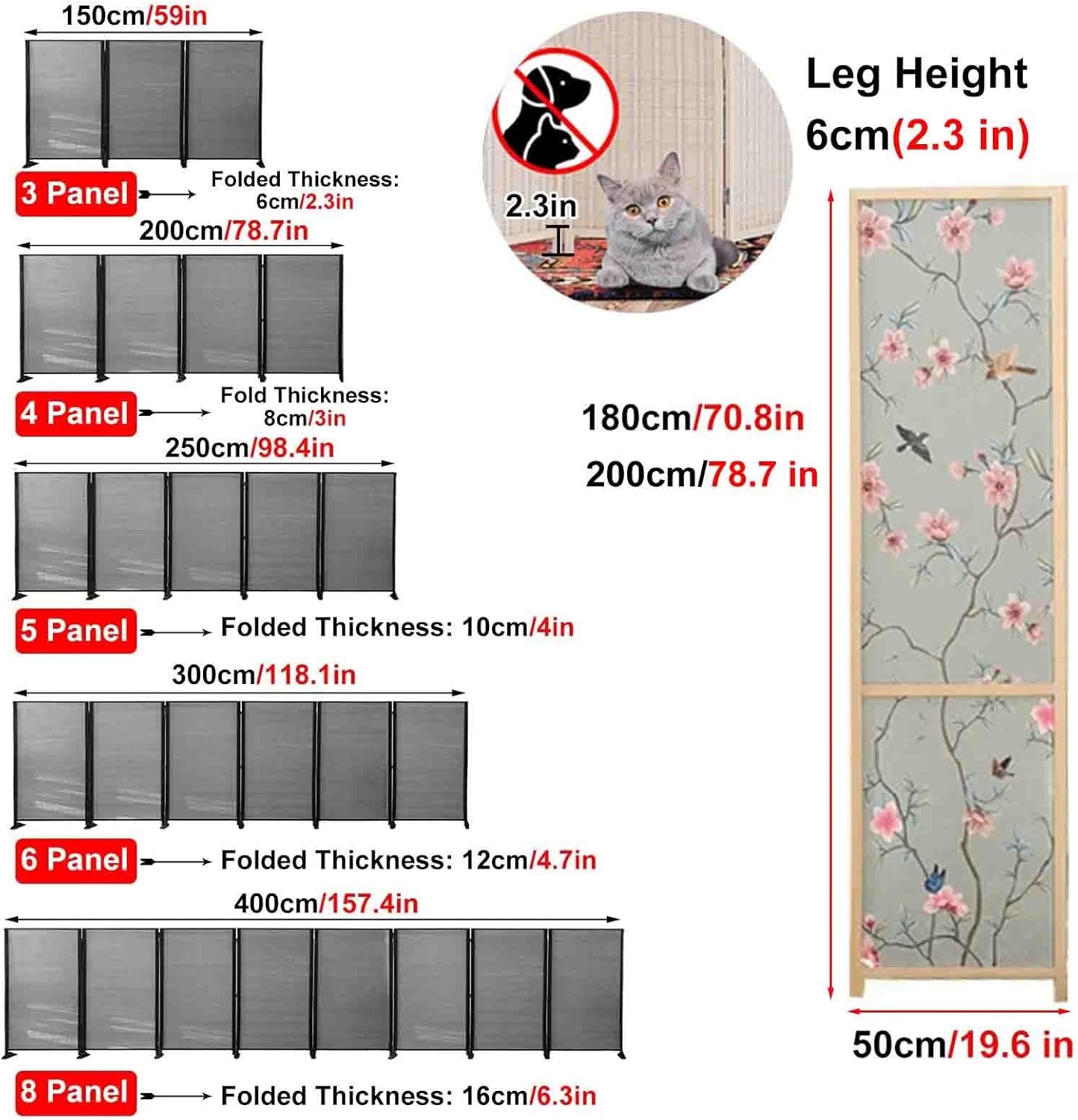 When we need to focus on ourselves, free from public distractions, have a private discussion, add privacy to your solitude, block out the light from the sun or the laptop, or just cover the mess temporarily, partition room divider just work perfect for you.●SpecificationsMaterial: Satin Fabric Screen and Wood FrameSingle Panel Width: 50cm(19.6 in)Single Panel Thickness: 2cm(4/5 in)Leg Height: 6cm(2.3 in)●FeaturesEasy to set up, move & store.Foldable room screen that allows you to adjust to the actual construction of the room.Wooden foot mat support provides more stability to the screen divider than others.It's lightweight for easy relocation and folds close for storage when not in use. ●Package Included: Room Divider Screen ×1Wood foot mat●Warm TipsManual measurement, there will be 1-3cm error, please understandIf a slight odor is normal, it will disappear within two to three daysDue to light and personal differences in color understanding, there will be small color difference,in kind prevail