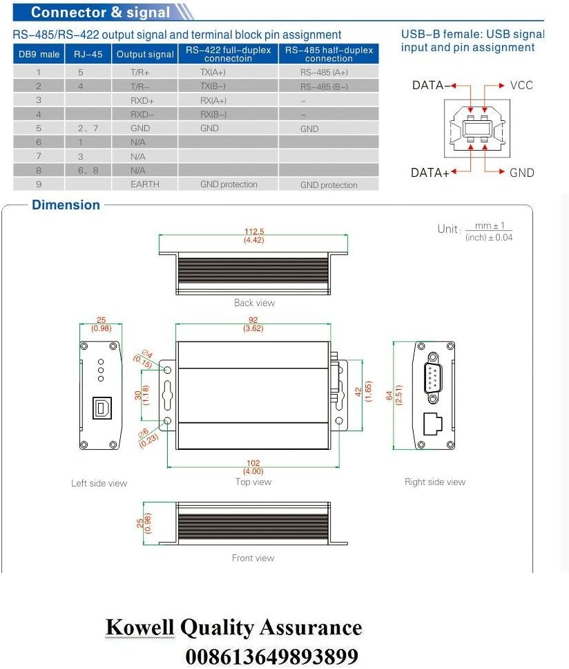 • Ports: USB-B female,RJ-45 and DB9 male ● Indicator: PWR, TXD, RXD ● Transmission media: Twisted pair or shielded cable ● Transmission rate:128,000bps to 300m, 38,400bps to 2.4Km, 9,600bps to 5km