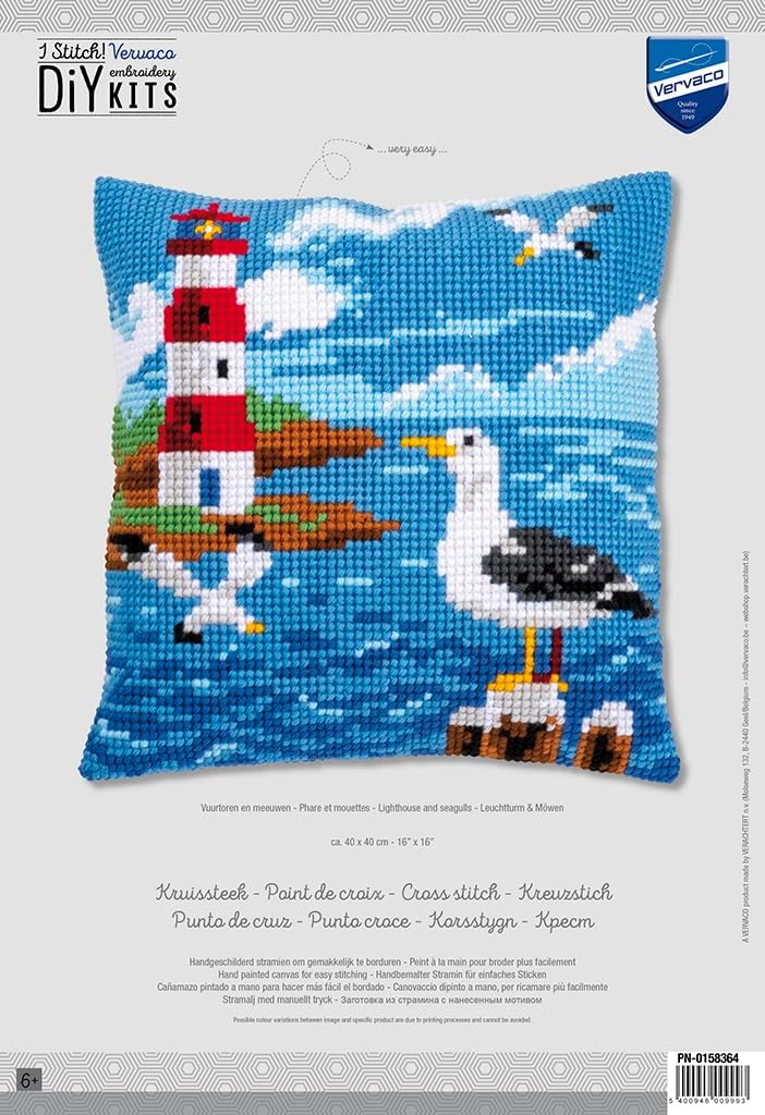 This nautical needlepoint pillow features a seagull perched on a wooden post as his gull friends fly over the bay with a tall red and white striped lighthouse in the background of this coastal scene. The sunny summer day at the ocean makes this beachy scene perfect for summer decorating. This kit includes hand-painted 4.5-mesh canvas, 100% acrylic yarn, needle, and complete instructions. Pillow backing and pillow form are not included. As the high-quality canvas is hand-painted with the design, it makes the stitching process easier and faster as you can stitch more accurately and check the chart less as you work. The 4.5-mesh canvas allows for a high level of detail in the finished design. The finished pillow design measures 16 x 16" (41 x 41cm). Imported from Europe. This needlepoint kit includes hand-painted 4.5-mesh canvas, 100% acrylic yarn, needle, and instructions. Design features a red and white lighthouse on a rocky shore with seagulls flying over the ocean and a seagull perched on a wooden post. Finished design measures 16 x 16" (41 x 41cm). Pillow backing and pillow form are not included.
