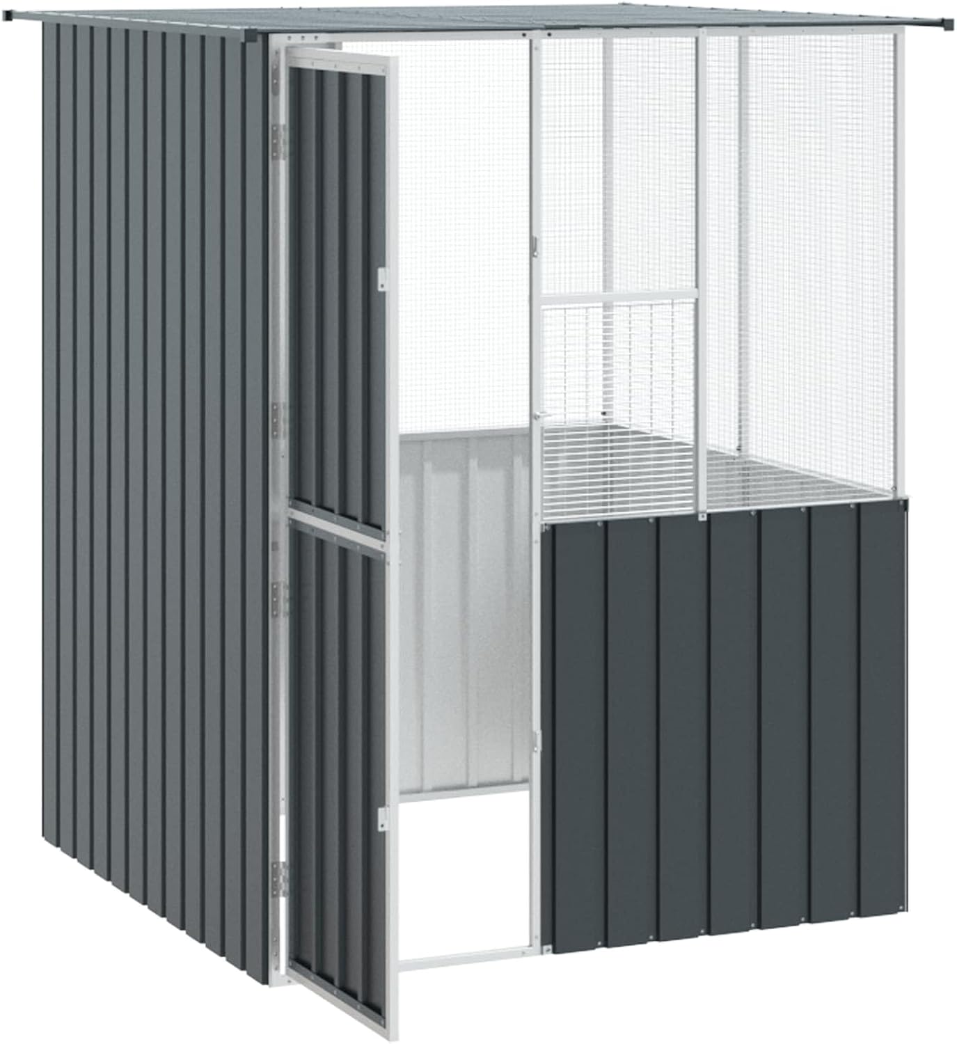 An elegant addition to your garden, this Outdoor Bird Cage mixes modern style with practicality, creating the ultimate hangout for your feathered buddies. The rectangular shape and sleek charcoal color give it a contemporary vibe, turning it into a stylish centerpiece for any outdoor area. With plenty of room for various birds, it creates an inviting space that blends perfectly with nature, boosting the looks of your garden.Galvanized Steel Frame Made from galvanized steel, this bird cage ensures a strong and safe environment for your pets. The material is weather-resistant, keeping its strength through all sorts of weather. Its solid design holds up to daily use while providing a protective space for your feathered friends.Spacious Living Area This outdoor cage, shaped like a rectangle, offers plenty of room for birds to fly and play. The spacious setup encourages natural behavior, letting birds thrive comfortably. This layout not only supports their wellbeing but also makes it easy for bird lovers to interact with their flocks.Functional Assembly Requirements Building it takes three people, using a scissor and drill. This organized process makes sure the cage is set up securely so birds can safely live there. Proper assembly helps make your pet's environment last longer and stay safe.Simple Maintenance Keeping it clean is a breeze, needing just regular cleaning to keep it looking great. This keeps things hygienic for your birds with minimal effort, giving you more time to enjoy and bond with them.Color: AnthraciteMaterial: Galvanised steelOverall dimensions: 64.96 x 64.96 x 78.74 in (L x W x H)Weight: 63.71 lbDurableOutdoor use onlyDelivery-contains:1 x Bird cageAssembly required: YesEAN: 8721158673770SKU: 3325168