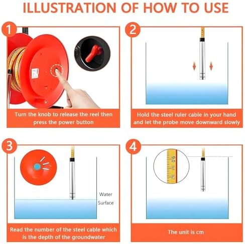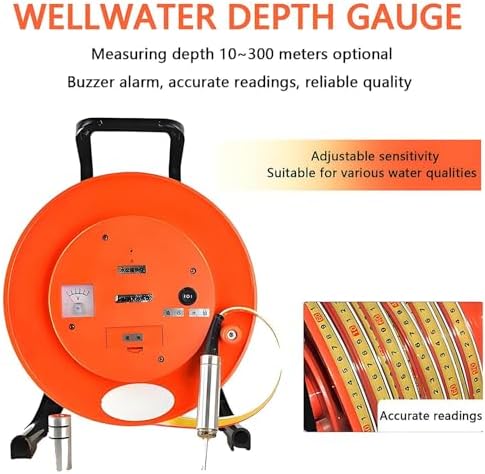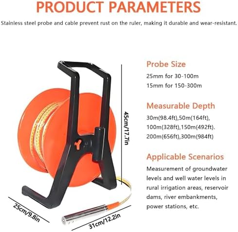 Introducing our versatile Water Level Meter, designed to provide accurate measurements for a variety of applications including wells, boreholes, water cisterns, and water level pipes. With a range of 10m to 300m, this device is ideal for both professional and DIY users, ensuring that you have the right tool for any water level measurement task. Our Water Level Meter features an easy-to-read resolution of 1mm, making it simple to monitor water levels precisely. The unique design includes two interchangeable probes; a larger 0.99in (25mm) diameter probe for depths of 10-100m and a smaller 0.6in (15mm) diameter probe for depths of 150-300m. Both probes are crafted from durable 304 stainless steel, ensuring long-lasting performance and easy cleaning. Safety and convenience are paramount with our water level indicator. The water-resistant contact point activates an indicator light and buzzer when it comes into contact with the water surface, allowing for clear and immediate feedback during operation. This feature is particularly useful when working in low-light conditions or deep wells. With an operating temperature range of -20℃ to +60℃ (-4°F to +140°F), this water depth gauge is built to withstand various environmental conditions. Please note that a 9V battery is required for operation (not included). The compact packaging size of 43×32×27cm (16.9×12.6×10.6 inches) makes it easy to store and transport, ensuring you can take your Water Level Meter wherever you need it. Whether you are a contractor, a farmer, or simply a homeowner wanting to monitor your water levels, our Water Level Meter is an essential tool that combines practicality with precision. Invest in reliable water measurement today and experience the convenience and accuracy that our Water Level Meter brings to your projects!