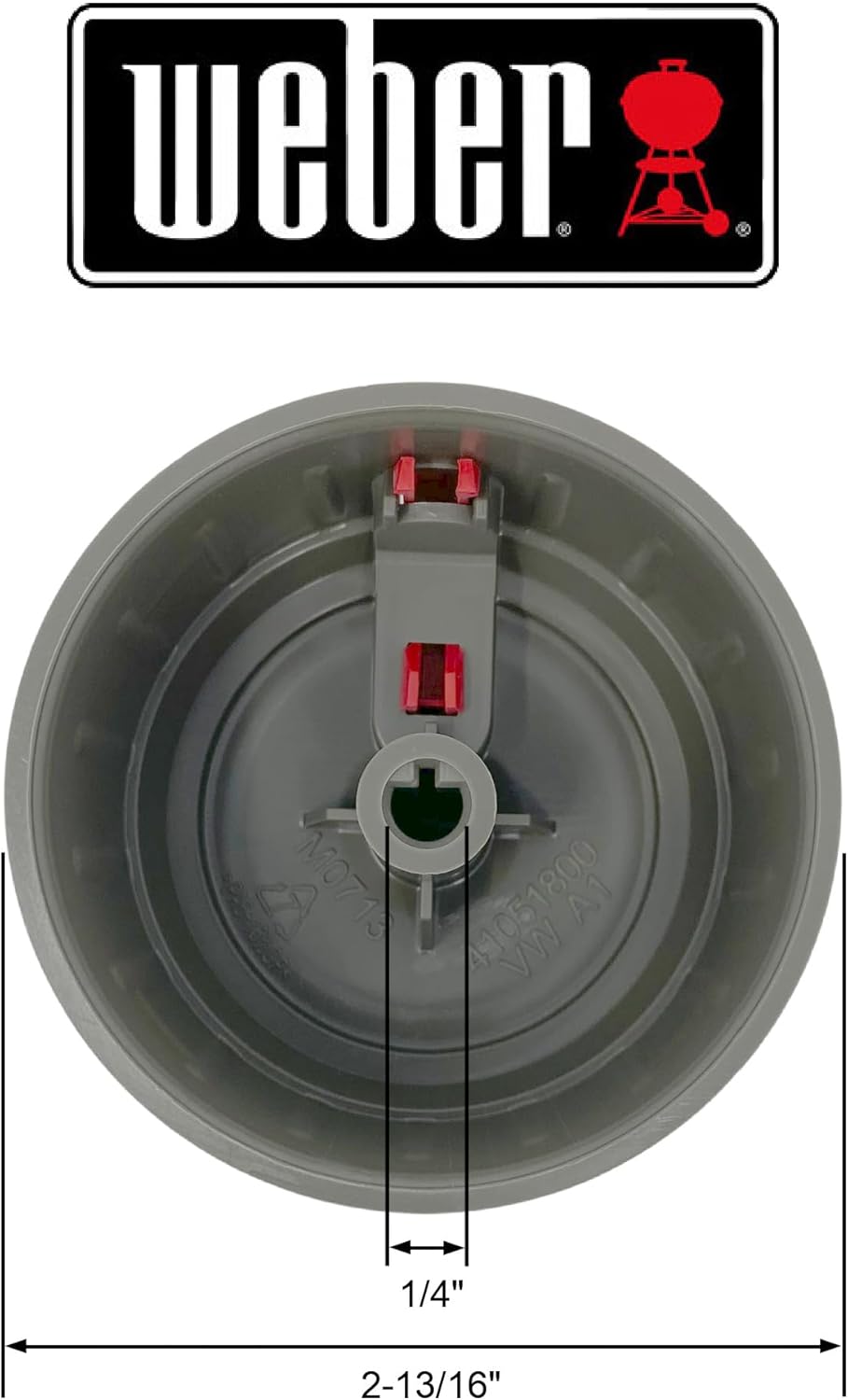 Genuine Weber Part 67029 Set of 3 main burner control knobs for Weber Spirit II 310 Series grills, model years 2017 and newer. Diameter of each measures 2-13/16". Dark gray knobs feature a red position indicator and Weber logo on the top. "D" shaped valve stem opening measures 1/4" in diameter.