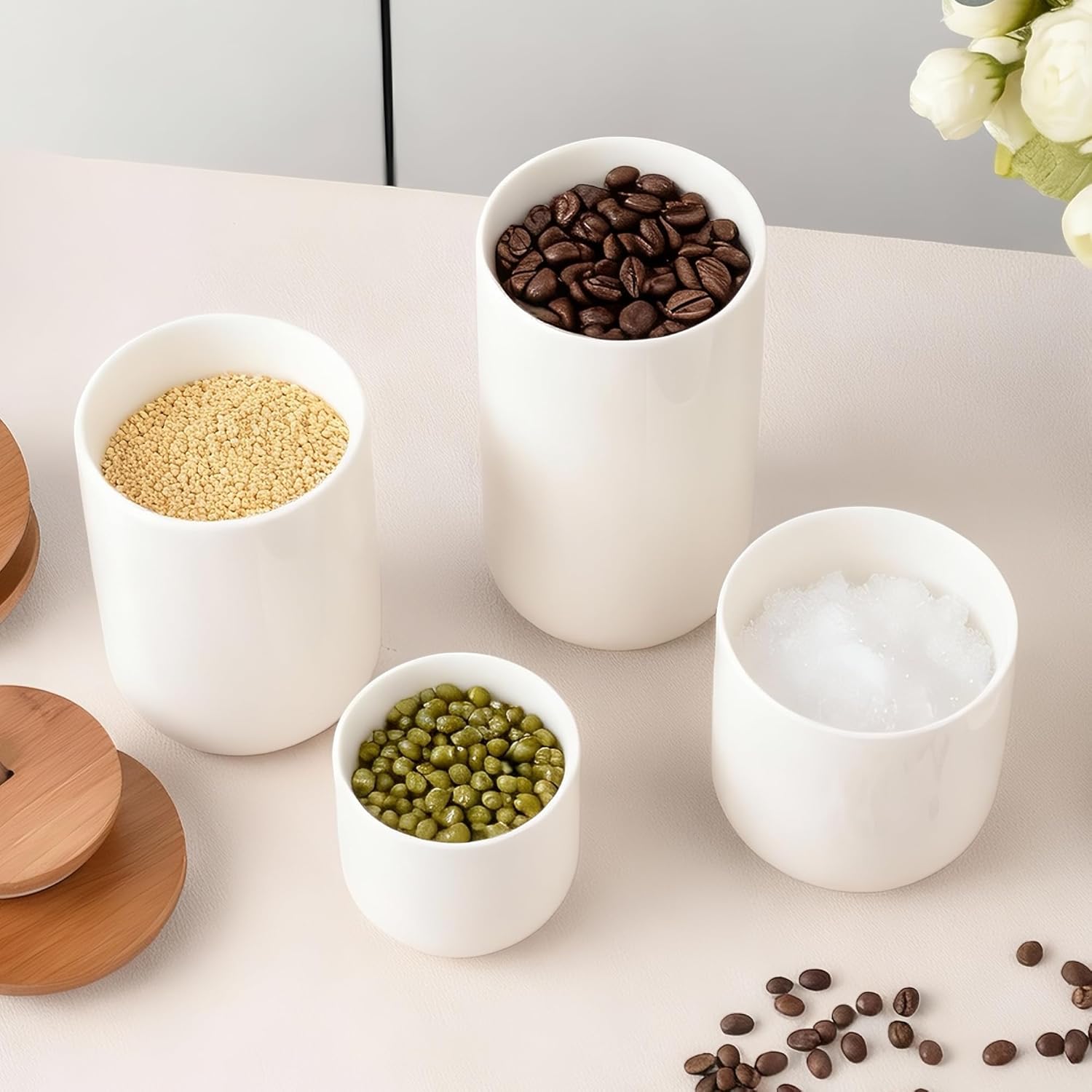 Transform Your Kitchen with the CoorFormer Ceramic Canister Set – 4-Piece Enhance your kitchen's organization and style with the CoorFormer Ceramic Canister Set. Designed for modern kitchens, this 4-piece set offers the perfect solution for storing a variety of pantry items such as coffee, flour, sugar, spices, tea, and even dry snacks like cookies and nuts. With four versatile sizes, these canisters cater to every storage need, making them a must-have addition to any kitchen. Crafted from high-quality ceramic, each canister is built to last and resists damage such as cracking and chipping. These canisters are far superior to other storage options like plastic or glass jars. The natural bamboo lids, featuring silicone seals, provide an airtight closure, ensuring your ingredients stay fresh and dry for longer periods. Whether used for kitchen essentials or bathroom supplies, the airtight functionality makes them perfect for any room in your home. Each canister features a wide-mouth opening, making it easy to fill and scoop out ingredients without spills or hassle. The set includes four sizes to meet different storage needs: the Smaller size (10 oz) is perfect for spices, the Small size (20 oz) is ideal for tea or sugar, the Medium size (28 oz) is great for flour or coffee, and the Large size (35 oz) is perfect for bulk items like pasta, cookies, or snacks. The thoughtful design ensures these canisters seamlessly fit into any kitchen décor, whether you’re aiming for a modern, rustic, or minimalist look. Their timeless aesthetic complements various styles, adding a touch of elegance to your home. In addition to their stylish appearance, these canisters are incredibly easy to maintain. The smooth ceramic body is simple to wipe clean, while the bamboo lids can be easily hand-washed to keep them looking new. Perfect for those who value both function and design, these canisters are ideal for organizing your pantry, upgrading your kitchen, or as a thoughtful gift. Make your home more organized and visually appealing with the CoorFormer Ceramic Canister Set – the ultimate blend of practicality and style.