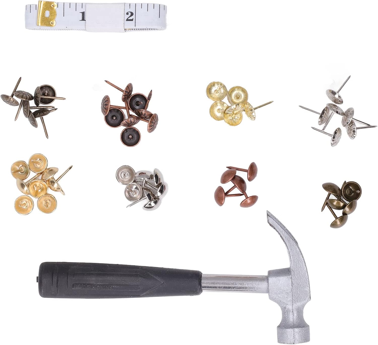 Our store dedicated to making your life time more wonderful, providing a wide variety of beautiful and practical home and garden products. Come and explore more elegant and meaningful options for your family and loved ones!Item Type: Upholstery TackMaterial: Carbon steelColour: Bronze, copper, gold, silver, chrysanthemum bronze, chrysanthemum copper, chrysanthemum gold, chrysanthemum silverNail Diameter: Approx.11mm/0.4inNail Length: Approx.16mm/0.6inCloth Ruler: Can measure 60in or 150cmQuantity: 100pcs bronze, 100pcs copper, 100pcs gold, 100pcs silver, 100pcs chrysanthemum bronze, 100pcs chrysanthemum copper, 100pcs chrysanthemum gold, 100pcs chrysanthemum silverPackage List:800 x Upholstery Tack1 x Cloth Ruler1 x Hammer20 x Anti Smashing Bracket1 x Storage Box