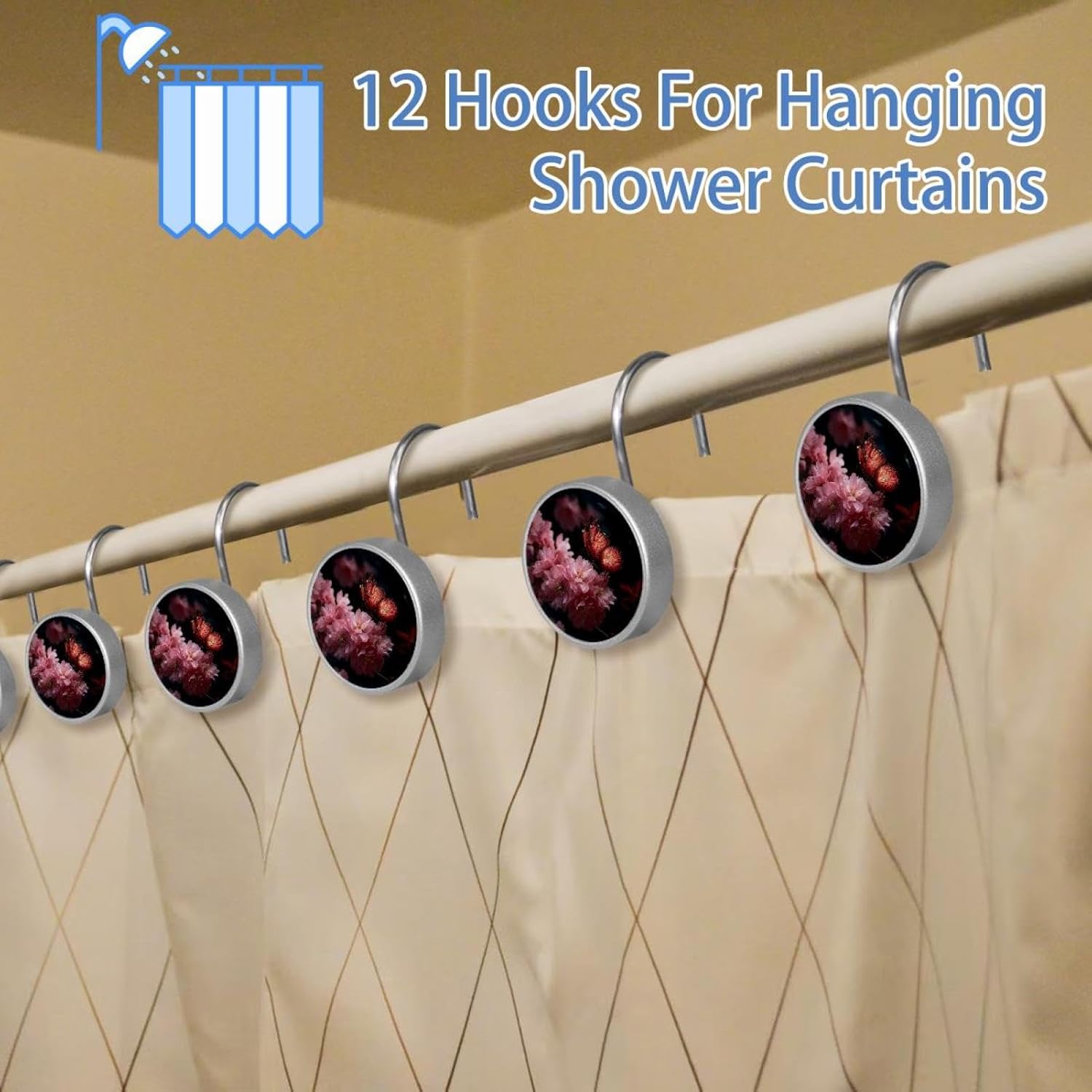 MATERIAL: glass, stainless steel. These shower curtain hooks can be decoration bathroom and will be long-lasting.12 pieces of shower curtain hooks, round crystal glass decoration, printed patterns, silver hooks to match various styles of bathroom shower curtains. SIZE: Crystal glass diameter of round shower curtain hook is 1.45x1.45in/ 3.7x3.7cm. The shower curtain hooks diameter is about 1.1in, 12 pieces shower curtain hooks are suitable for rod of 8-28mm(0.3"-1.1"). RUST RESISTANT:Shower hooks are made of stainless steel and crystal glass, which is durable, rust-proof and corrosion-resistant, it will not rust suitable for wet bathroom environment. EASY TO INSTALL:Hand the shower curtain hooks hold securely on straight or curved shower curtain rods,slid easily and smoothly. Easy to install and decorate your bathroom. BEAUTIFUL AND ELEGANT:Beautiful Love hook add charming scenery for your bathroom, baby room, bedroom, living room, and the gorgeous style is easy to match with any kinds of bathroom shower curtain. EASY GLIDE: Open and close your shower curtain quickly and easily with the Shower Hooks, easily glides on shower curtain rods and tension rods. No snagging; no effort; no hassle PACKAGE: 12 shower curtain hooks in a pack.The bathroom curtain hook has a smooth appearance and can be hung on the pole to pull it at will. Special price 12 sets to meet your needs.