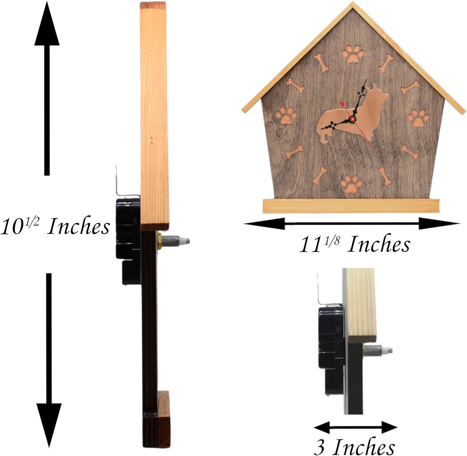 CORGI Personalized Wall Clock Introducing our New Personalized Wall Clock with your breed as the centerpiece. The clock face is designed in DogPound Creations' signature doghouse shape with dog bone and pawprint details carved directly into the clock face Accented in your choice of 3 stains and 3 metallic colors, gives you 9 passible combinations to create a custom look. (Note: If you don’t see your breed in our shop, please ask. If we don’t have it we will design it) DIMENSIONS↔ 11.1” (23.2cm) width ↕ 10.5” (39.2cm) height DETAILS Personalization is FREE and encouraged Our clock is made from Baltic Birch & Northern Pine wood We laser engrave our personalization on the bottom Pine strip Quartz clock movement with second sweep hand This Clock is accurate to 1sec per year Requires 1 AA battery (not included) CUSTOM ORDERS We regularly create special requests on all our products We NEVER charge any more for custom requests We always send you a proof for approval before you order BULK PURCHASES We do offer wholesale pricing on all our products Price incentives start at quantities of 10 or more Combinations of 10+ products are allowed Please message us for more information We welcome the opportunity to provide you with our fine quality woodcraft gifts Kindly, DogPound Creations