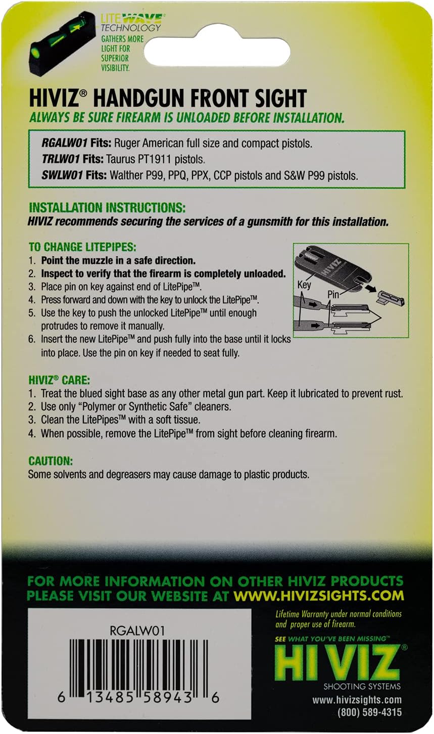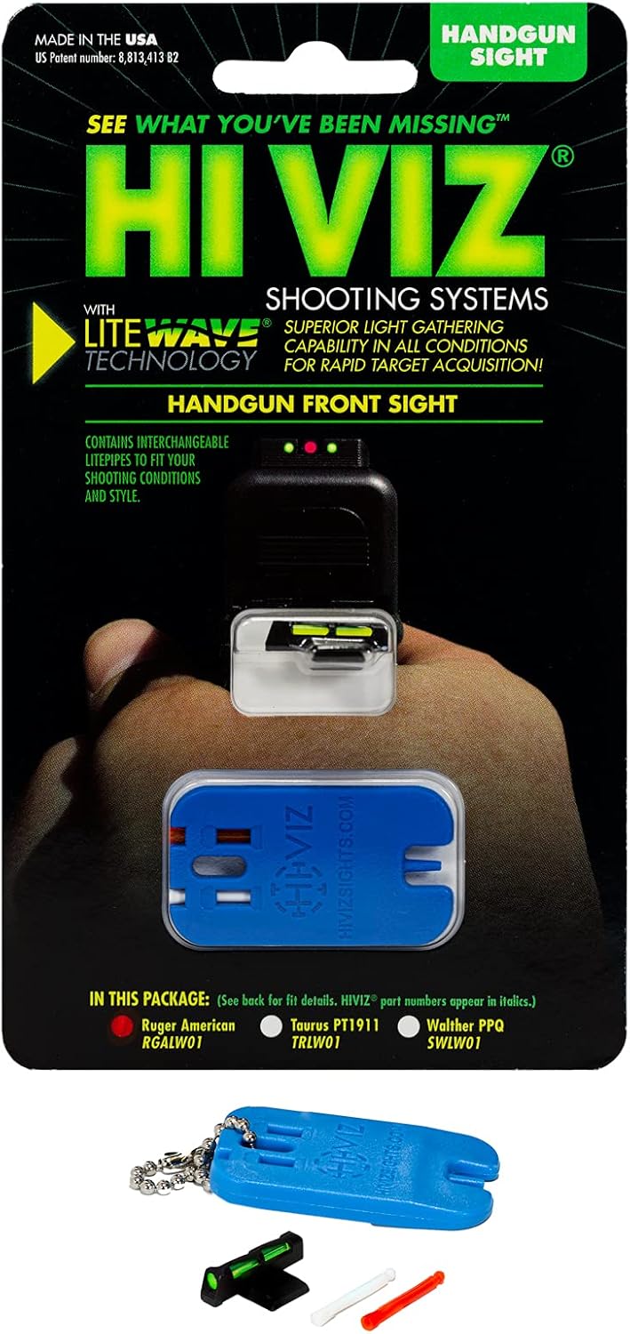 Improve the performance of your Ruger American with the litewave sight. The bright and ultra-durable litewave sights will enhance your confidence and shooting experience. Features: - litewave interchangeable LitePipe design - all steel construction - factory height front sight compatible with factory rear sights. Includes: - green, Red and white LitePipes. Specifications: - fits: Ruger American models fullsize and compact - LitePipe diameter 0.090 - blade width 0.125 - replacement LitePipe handgun version # 5