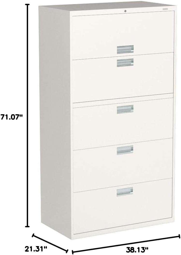 Well-engineered and incredibly strong, Brigade 600 Series laterals from HON are built for the demands of high-activity filing. This five-drawer, 36"W model features a sturdy double-walled base to resist tampering and strengthen the case. It accepts letter or legal hanging file folders. Bright Aluminum handle coordinates with Brigade pedestals. Finish color is Light Gray.