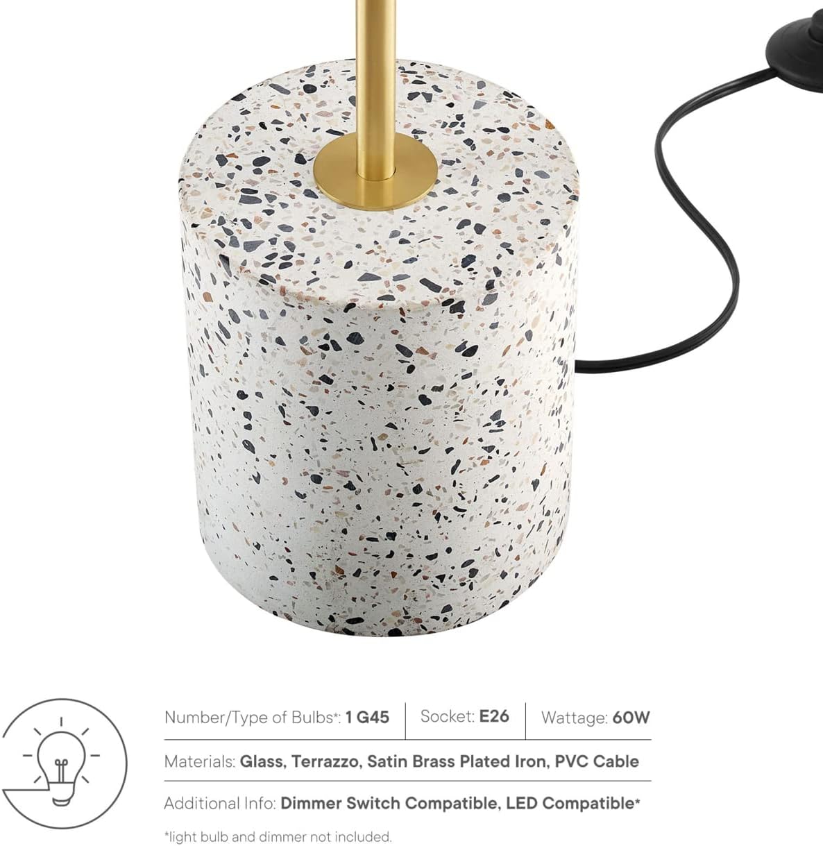 Bring intrigue into your home ambient lighting with the Logic Terrazzo Floor Lamp in your bedroom, living room, office, or study. This tall standing lamp dispenses a tranquil aura complementing mid-century modern, contemporary, or eclectic decors. A captivating floor lamp for the living room, Logic illuminates with an opaque glass globe shade resting on a satin brass rod rising from a smooth terrazzo column base. This sculpted reading floor lamp has a black power cord with a convenient on/off switch. A modern floor lamp, Logic takes 1 G45 E12 40W max bulb or LED equivalent (not included). Compatible with dimmer switches (not included). Assembly required. Clean with a soft, damp cloth. Set Includes: 1 - Logic Product Dimensions: Overall Product Dimensions: 10"L x 10"W x 63"H Shade Dimensions: 2.5 - 10"L x 2.5 - 10"W x 9.5"H Base Dimensions: 6"L x 6"W