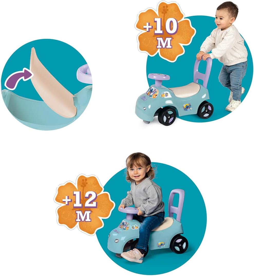 Stable 2-in-1 stand, ergonomic, lightweight and easy to use, can be used from 10 months. Walking aid handle, steering wheel, anti-roll stops, under the saddle boot.